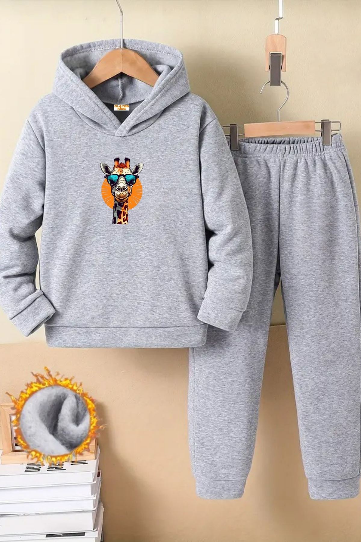Çocuk Gri Kapüşonlu Eşofman Takımı Şardonlu Kumaş Kışlık İkili Set - Gözlüklü Zürafa Baskılı