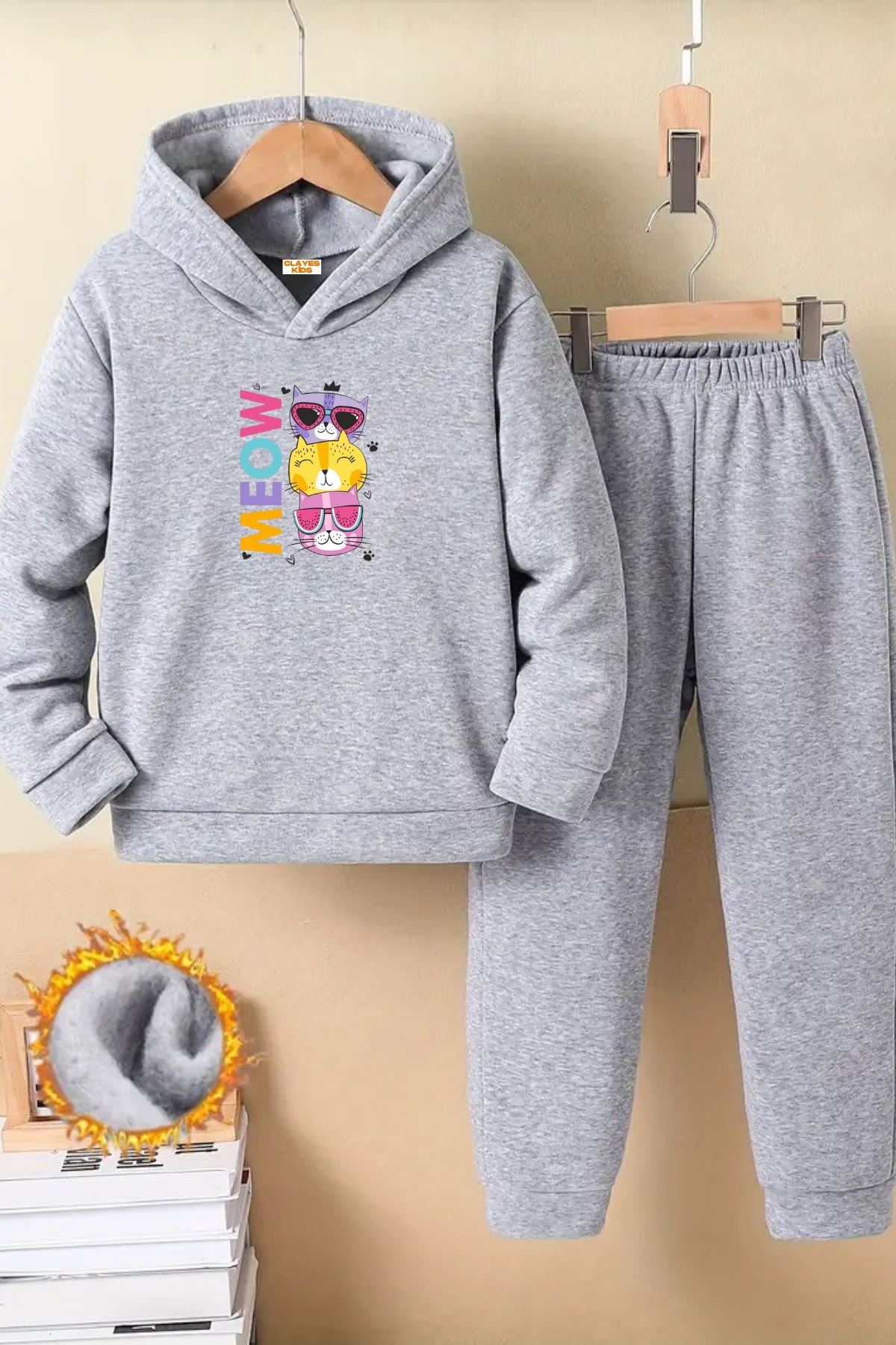 Çocuk Gri Kapüşonlu Eşofman Takımı Şardonlu Kumaş Kışlık İkili Set - MEOW Kedicikler Baskılı