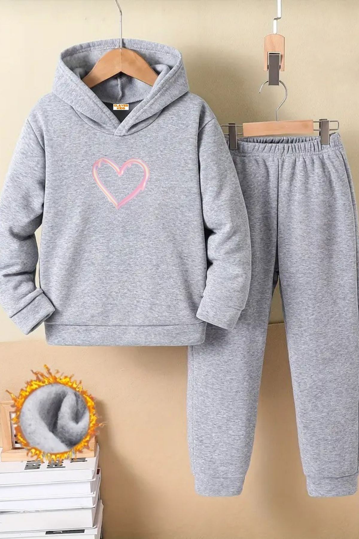 Çocuk Gri Kapüşonlu Eşofman Takımı Şardonlu Kumaş Kışlık İkili Set - Pembe Kalp Baskılı