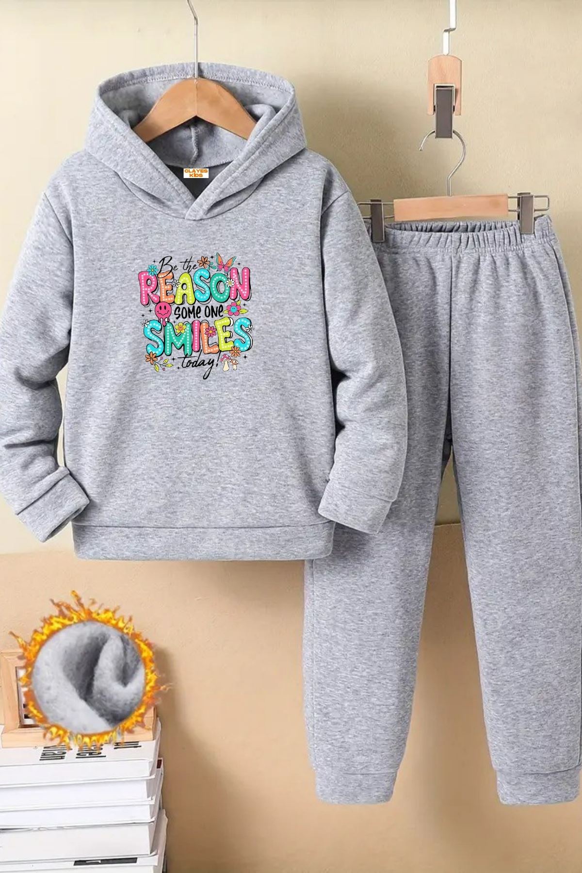 Çocuk Gri Kapüşonlu Eşofman Takımı Şardonlu Kumaş Kışlık İkili Set - Renkli Reason Smiles Baskılı