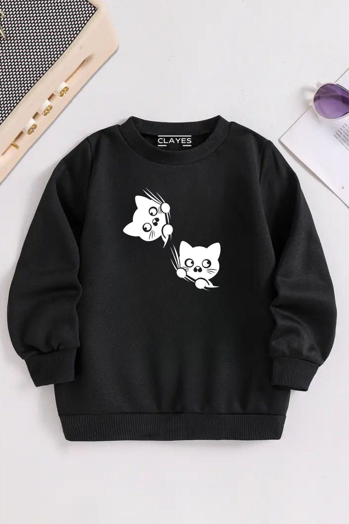 Çocuk Siyah Bisiklet Yaka 2Lİ KEDİ Baskılı, Kışlık Kalın Şardonlu Kumaş