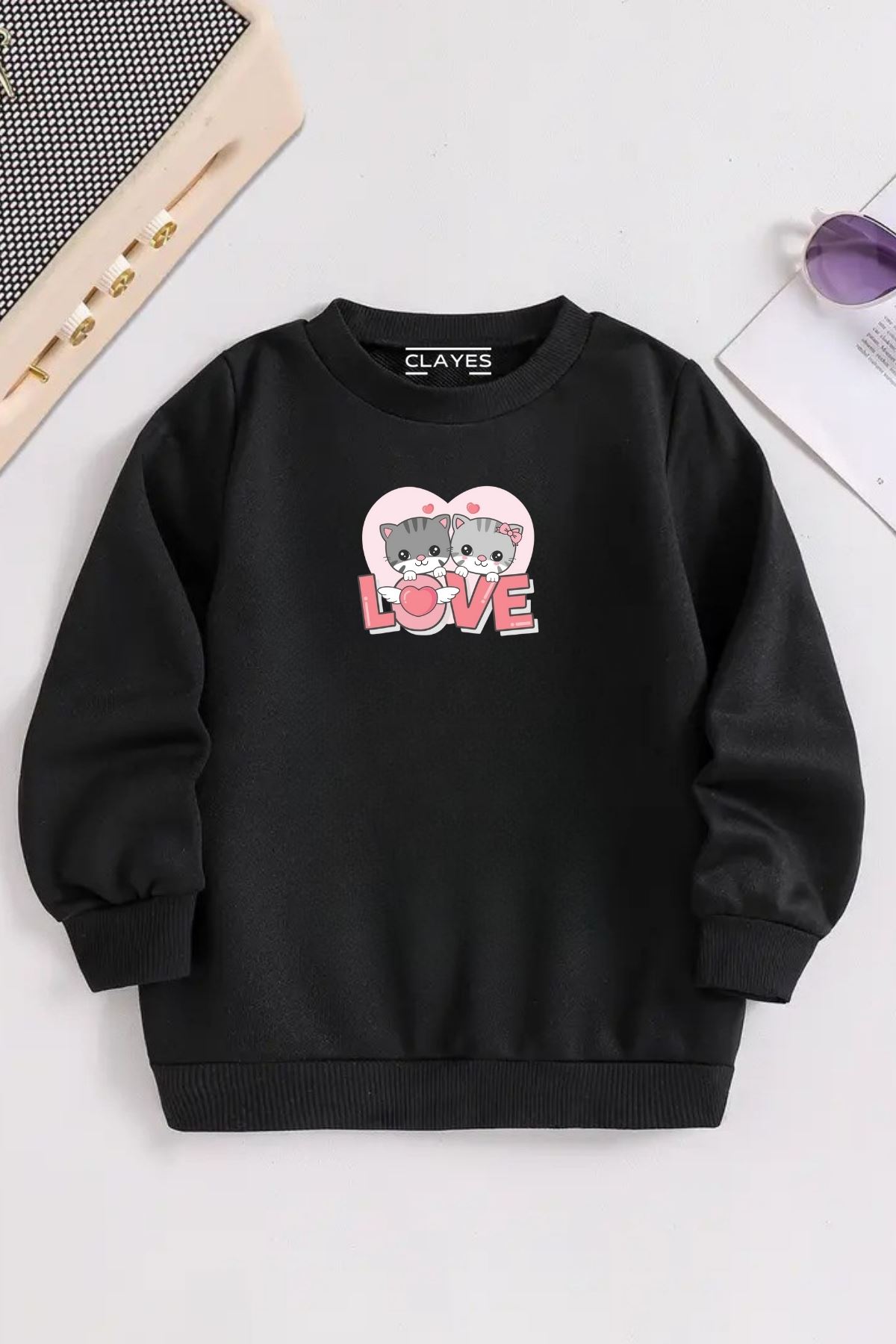 Çocuk Siyah Bisiklet Yaka 2Lİ LOVE KEDİ Baskılı, Kışlık Kalın Şardonlu Kumaş