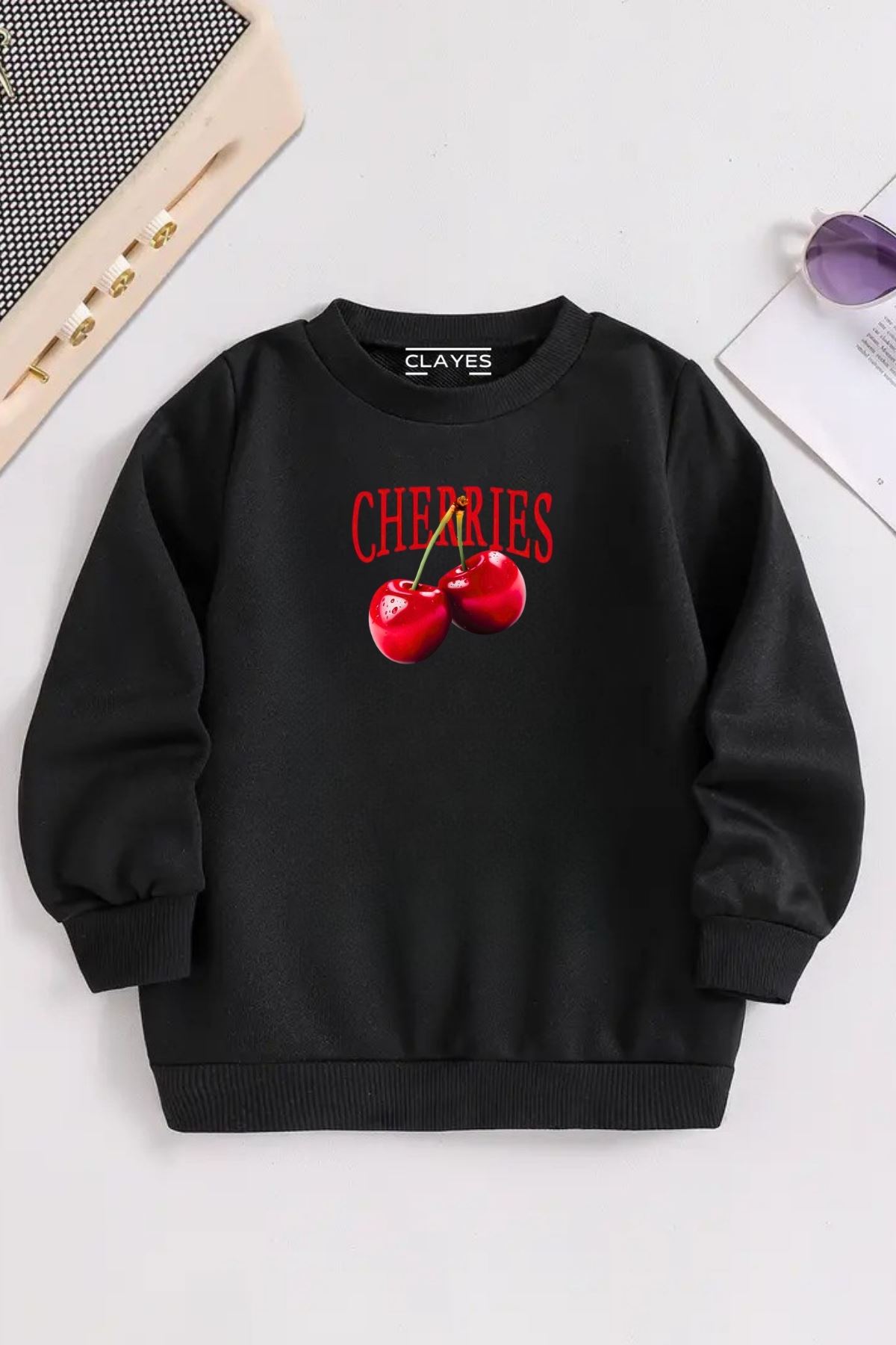 Çocuk Siyah Bisiklet Yaka CHERRIES Baskılı, Kışlık Kalın Şardonlu Kumaş