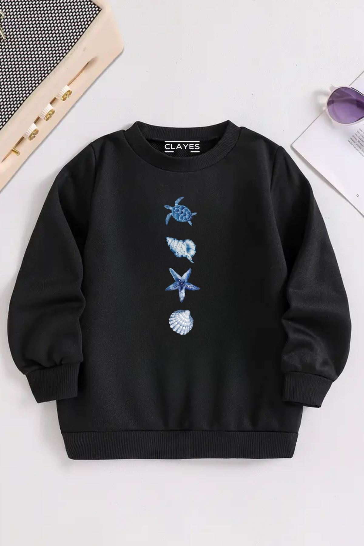 Çocuk Siyah Bisiklet Yaka DİKEY DENİZ CANLILARI Baskılı, Kışlık Kalın Şardonlu Kumaş