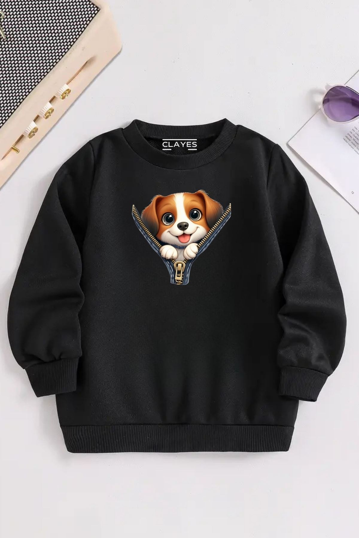 Çocuk Siyah Bisiklet Yaka FERMUAR KÖPEK Baskılı, Kışlık Kalın Şardonlu Kumaş