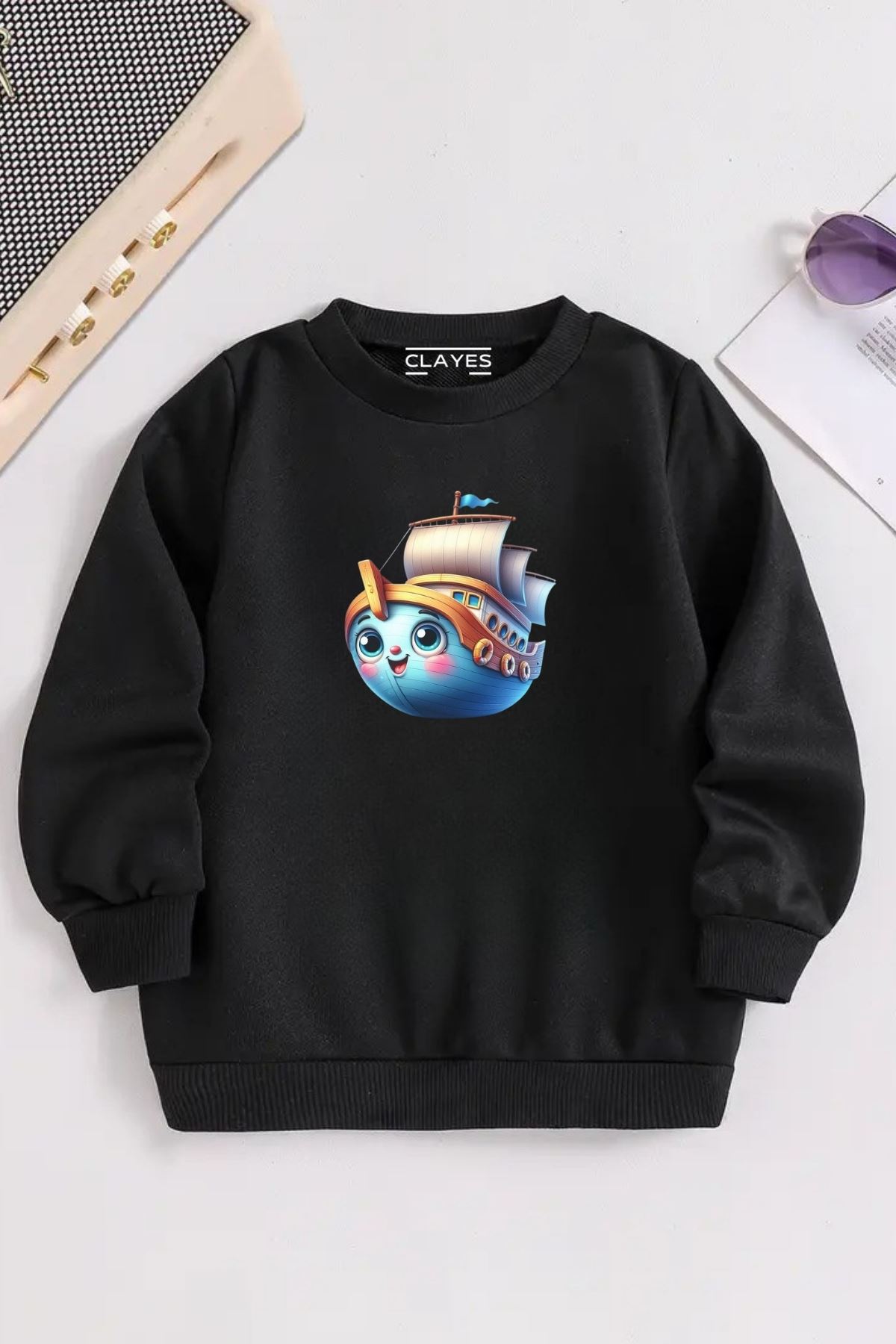 Çocuk Siyah Bisiklet Yaka GEMİ Baskılı, Kışlık Kalın Şardonlu Kumaş