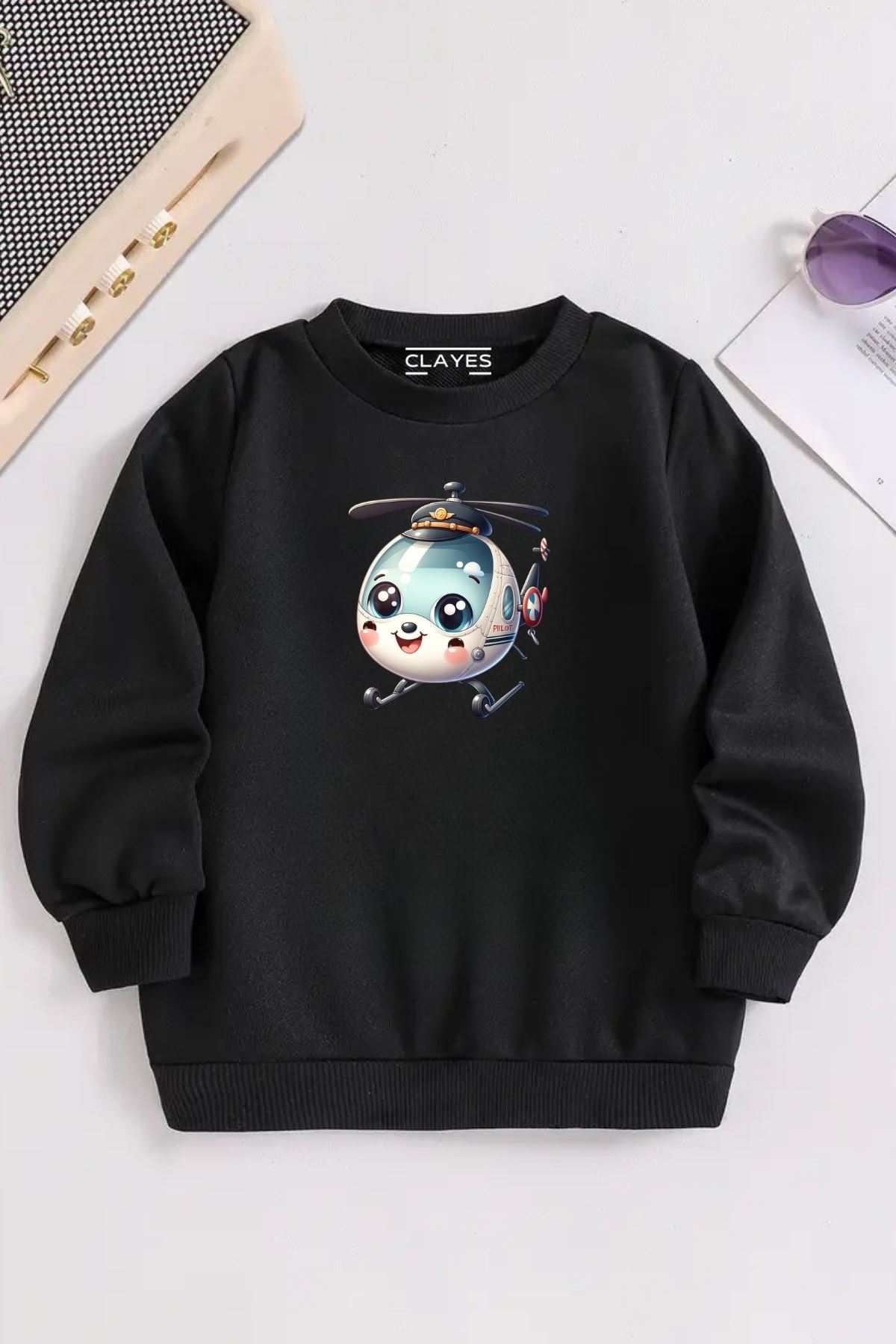 Çocuk Siyah Bisiklet Yaka HELİKOPTER Baskılı, Kışlık Kalın Şardonlu Kumaş