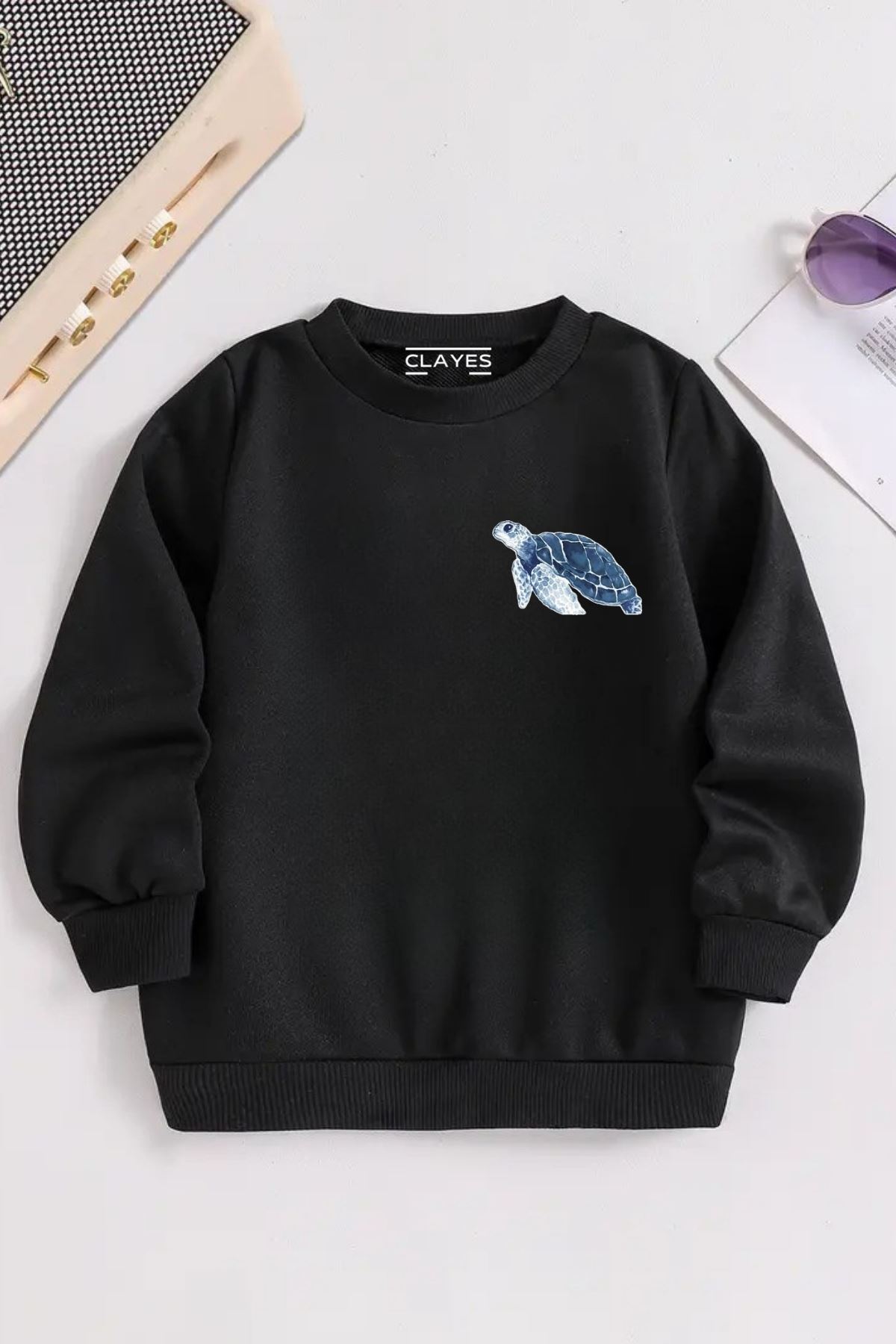 Çocuk Siyah Bisiklet Yaka KAPLUMBAĞA MİNİMAL Baskılı, Kışlık Kalın Şardonlu Kumaş