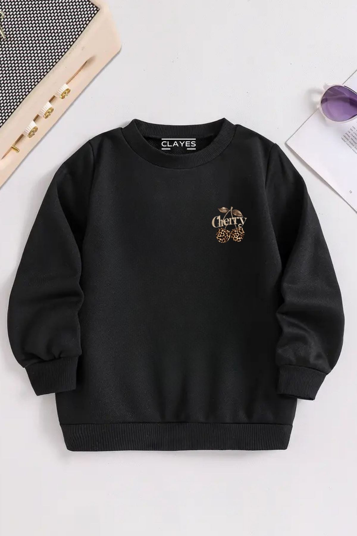 Çocuk Siyah Bisiklet Yaka LEOPAR CHERRY MİNİMAL Baskılı, Kışlık Kalın Şardonlu Kumaş