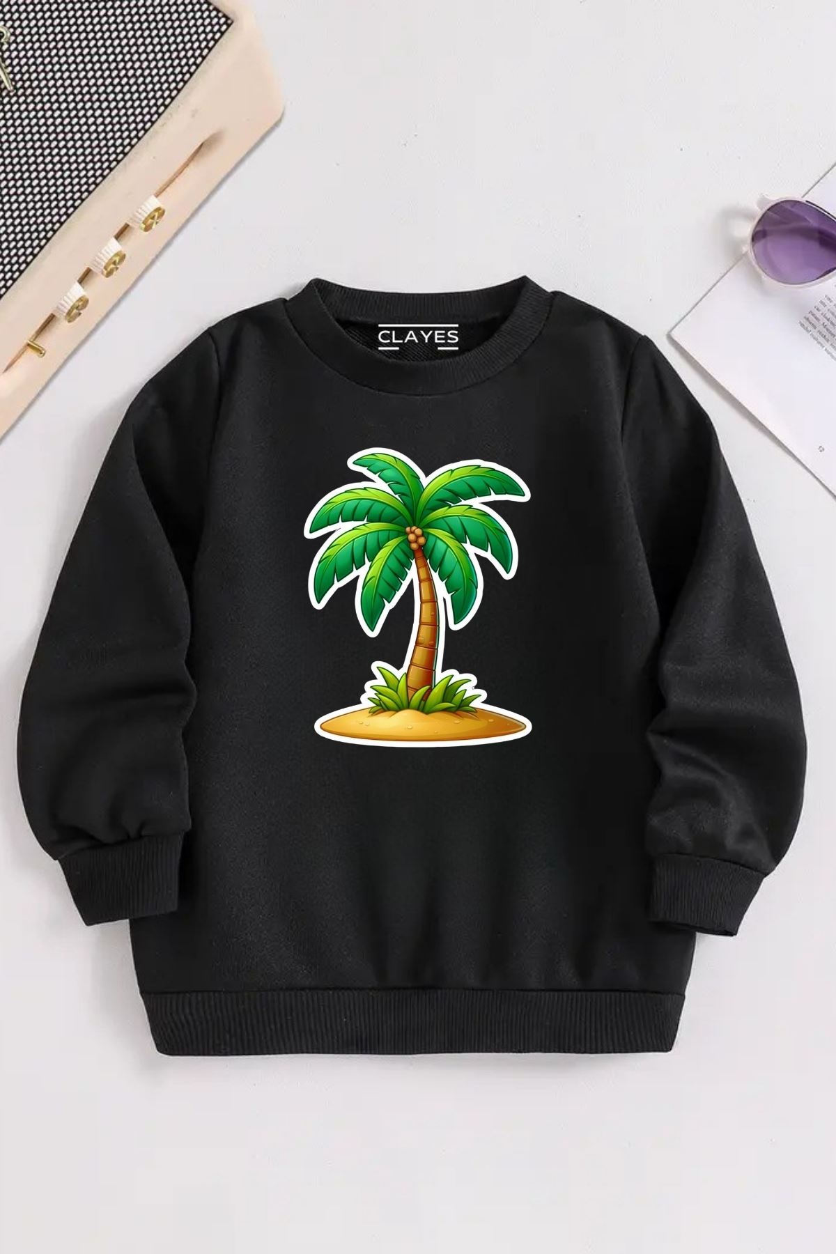 Çocuk Siyah Bisiklet Yaka PALMİYE Baskılı, Kışlık Kalın Şardonlu Kumaş