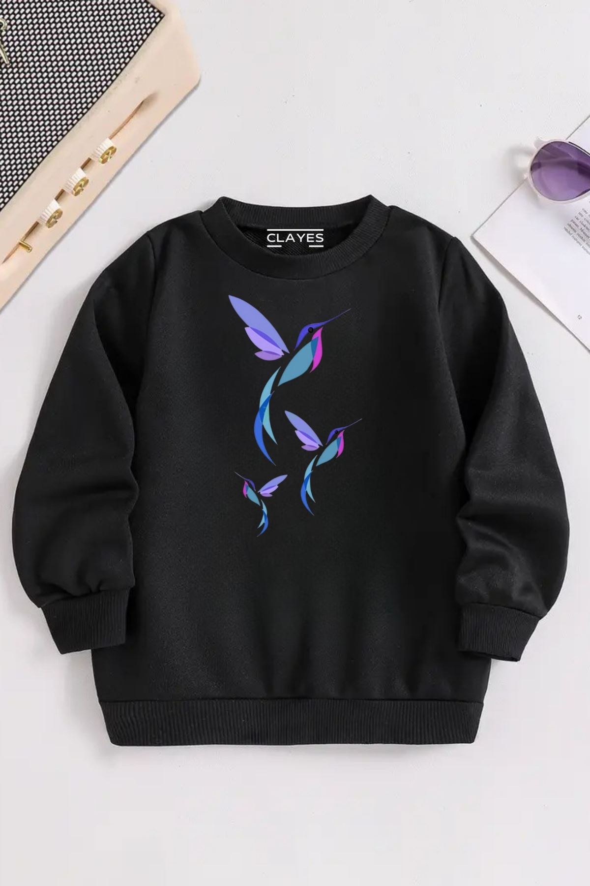 Çocuk Siyah Bisiklet Yaka RENKLİ KUŞLAR Baskılı, Kışlık Kalın Şardonlu Kumaş