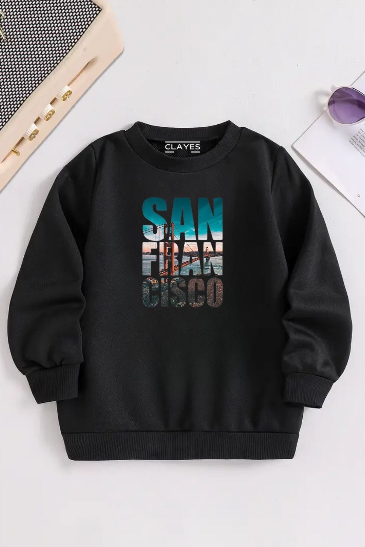 Çocuk Siyah Bisiklet Yaka SAN FRANCISCO Baskılı, Kışlık Kalın Şardonlu Kumaş