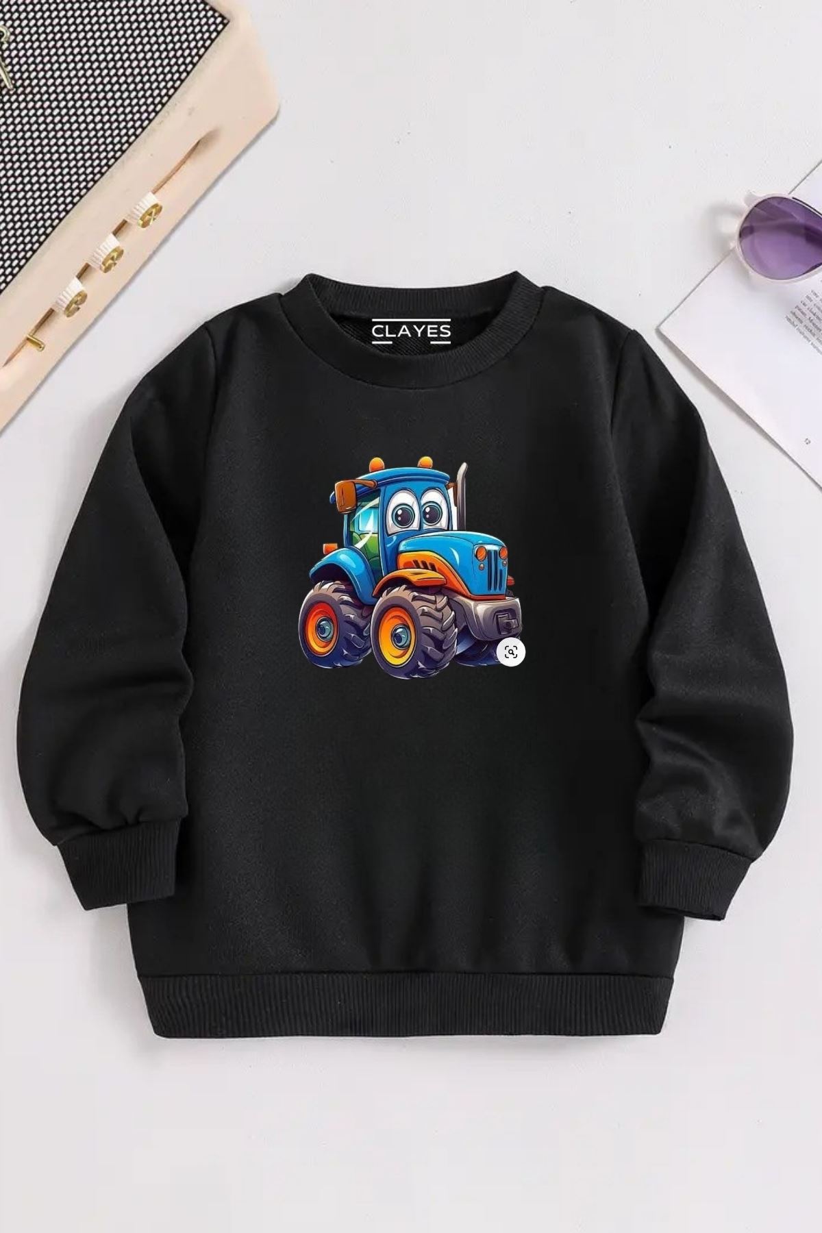 Çocuk Siyah Bisiklet Yaka SEVİMLİ TRAKTÖR Baskılı, Kışlık Kalın Şardonlu Kumaş