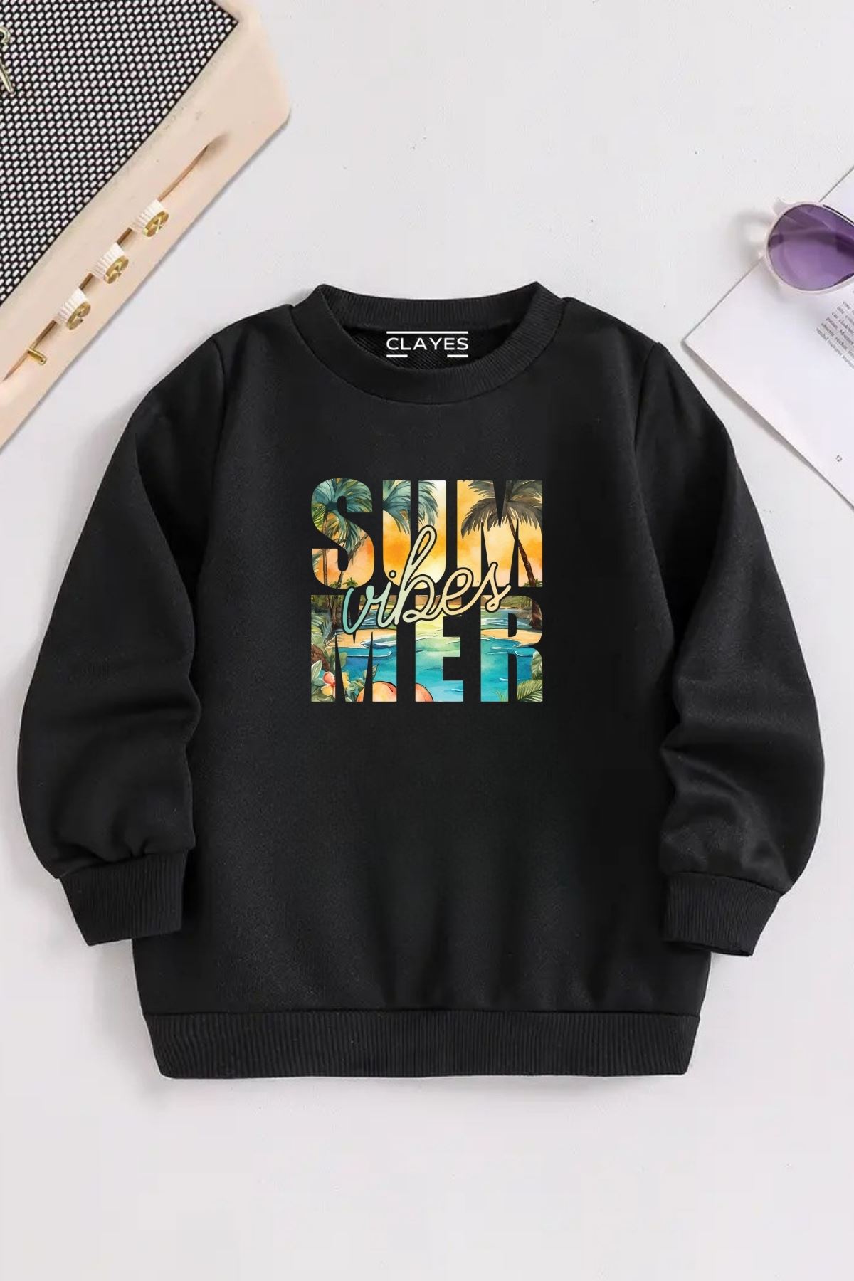 Çocuk Siyah Bisiklet Yaka SUMMER VIBES Baskılı, Kışlık Kalın Şardonlu Kumaş