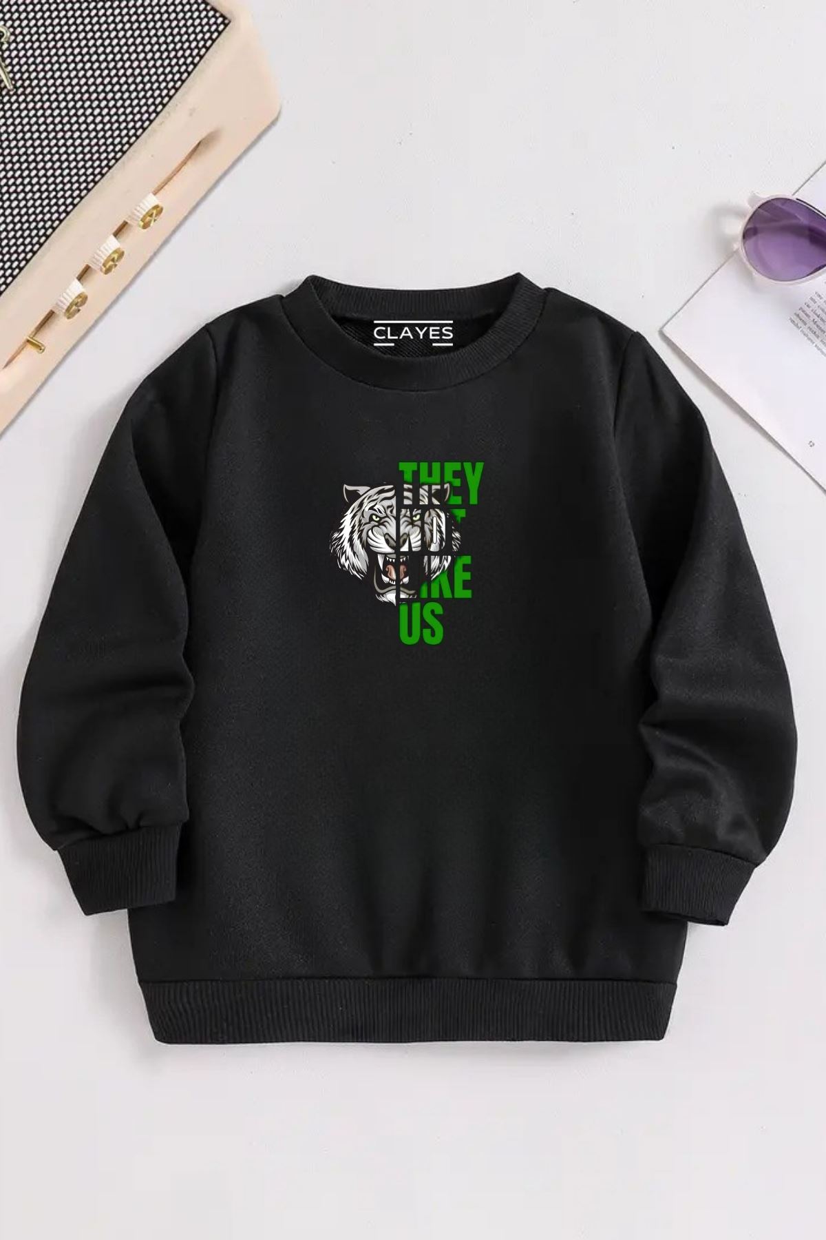 Çocuk Siyah Bisiklet Yaka THEY LİKE KAPLAN Baskılı, Kışlık Kalın Şardonlu Kumaş