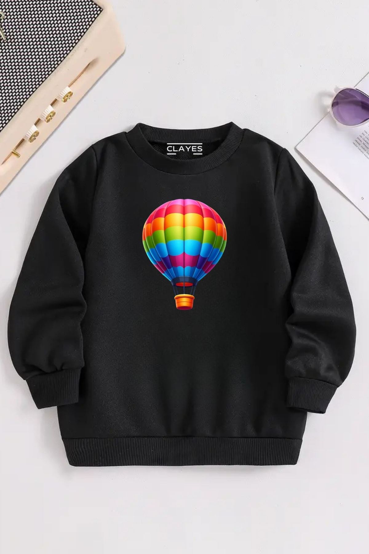 Çocuk Siyah Bisiklet Yaka UÇAN BALON Baskılı, Kışlık Kalın Şardonlu Kumaş