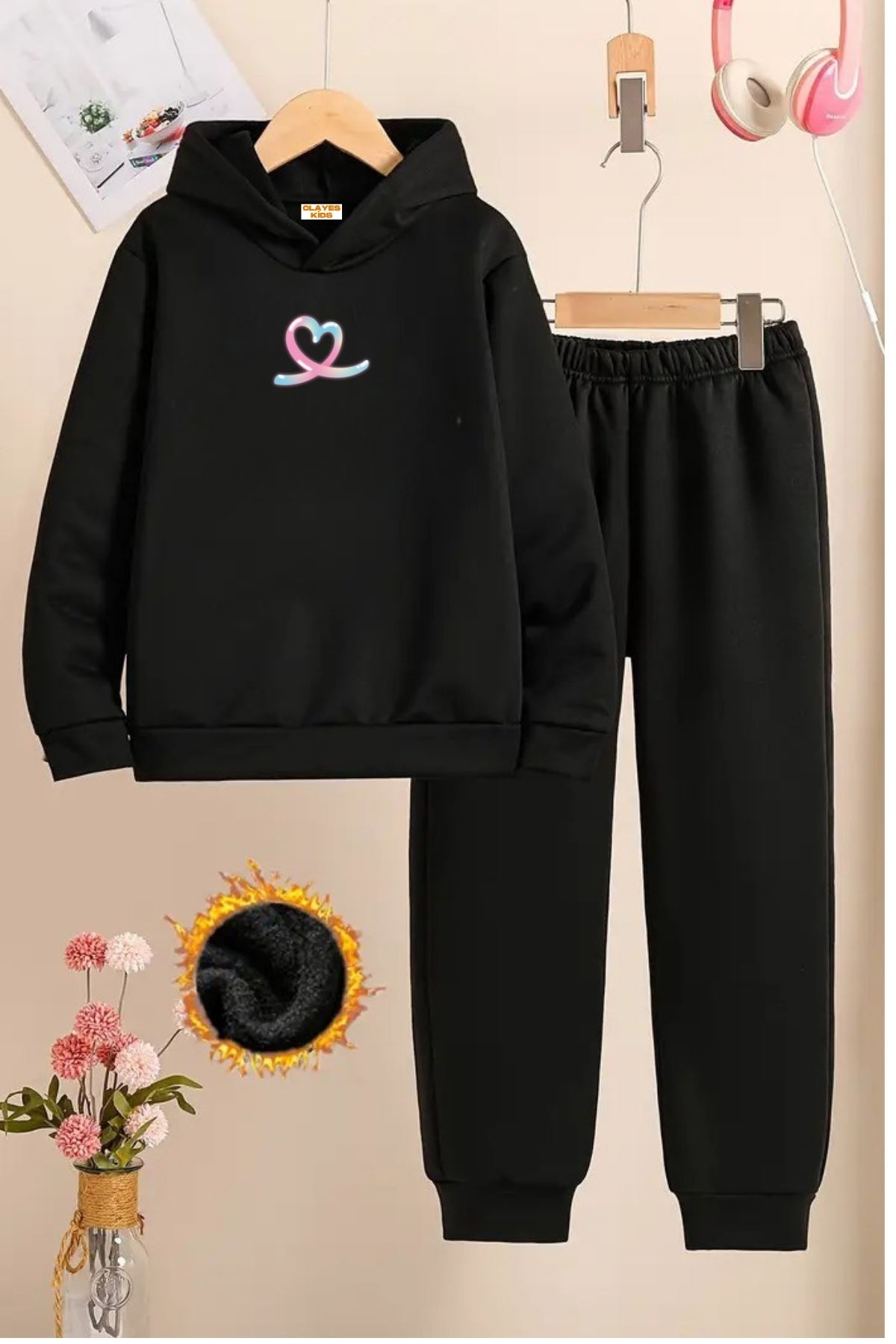 Çocuk Siyah Eşofman Takımı-PEMBE MAVİ KALP Baskılı-Şardonlu Kumaş