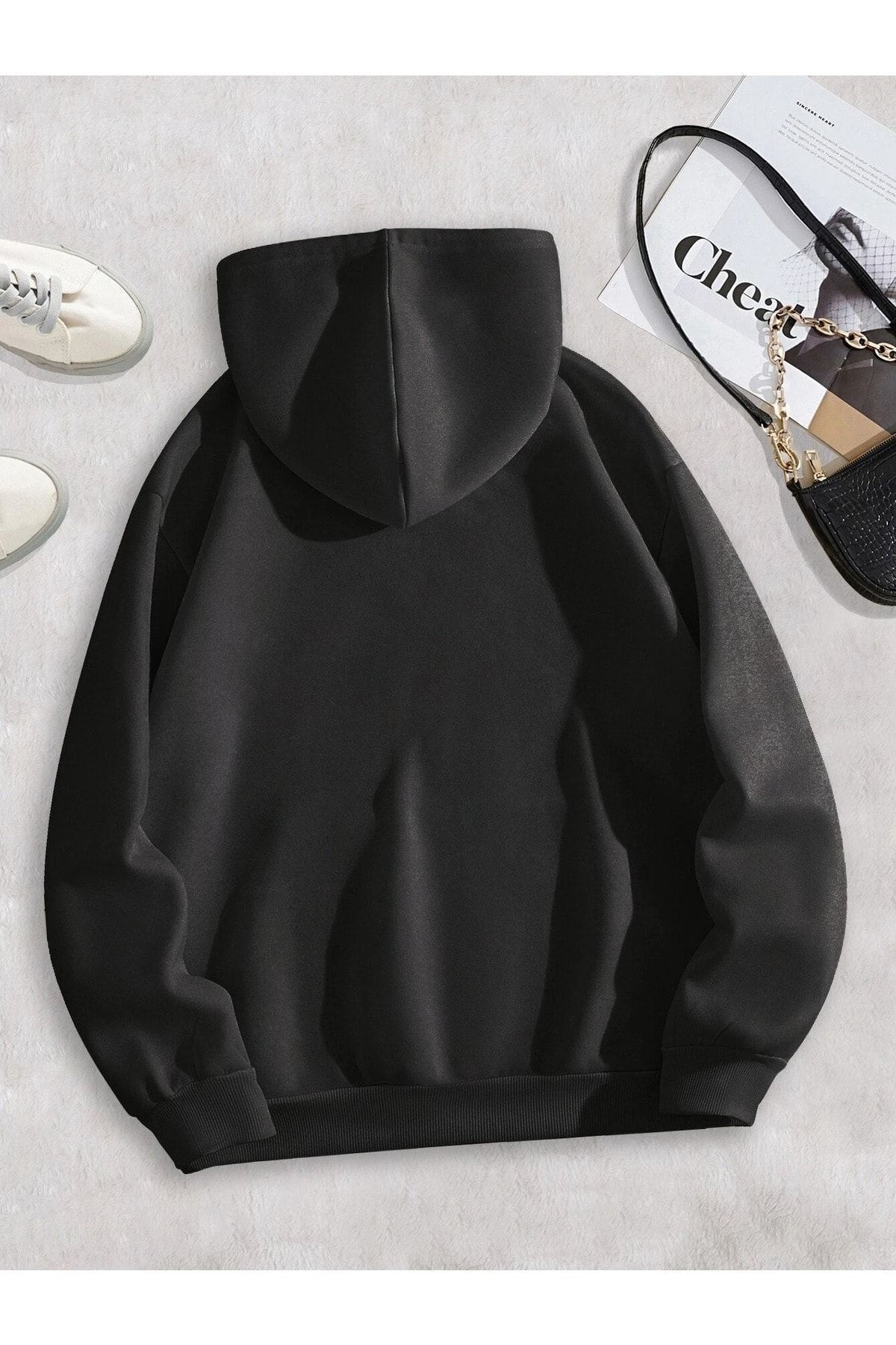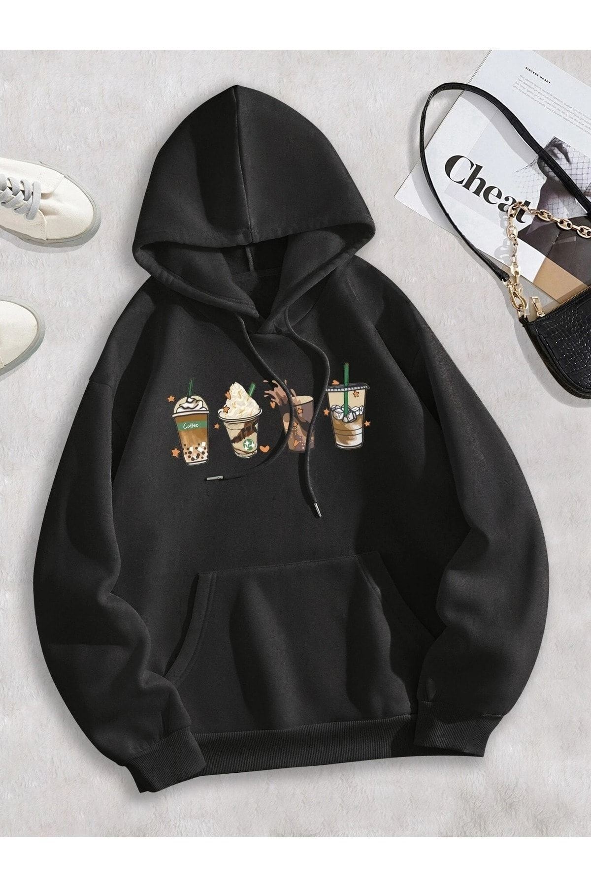 Coffe Sweatshirt - Siyah Baskılı Oversize Kapüşonlu
