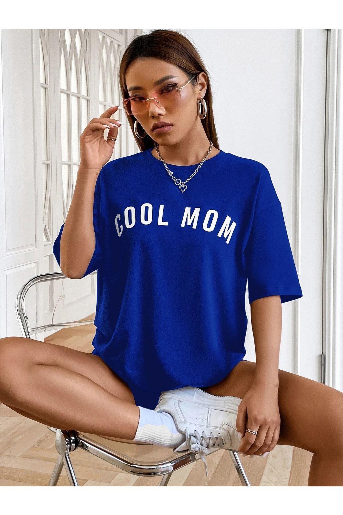 Cool Mom T-shirt - Lacivert Baskılı Oversize Bisiklet Yaka Kısa Kol Tişört