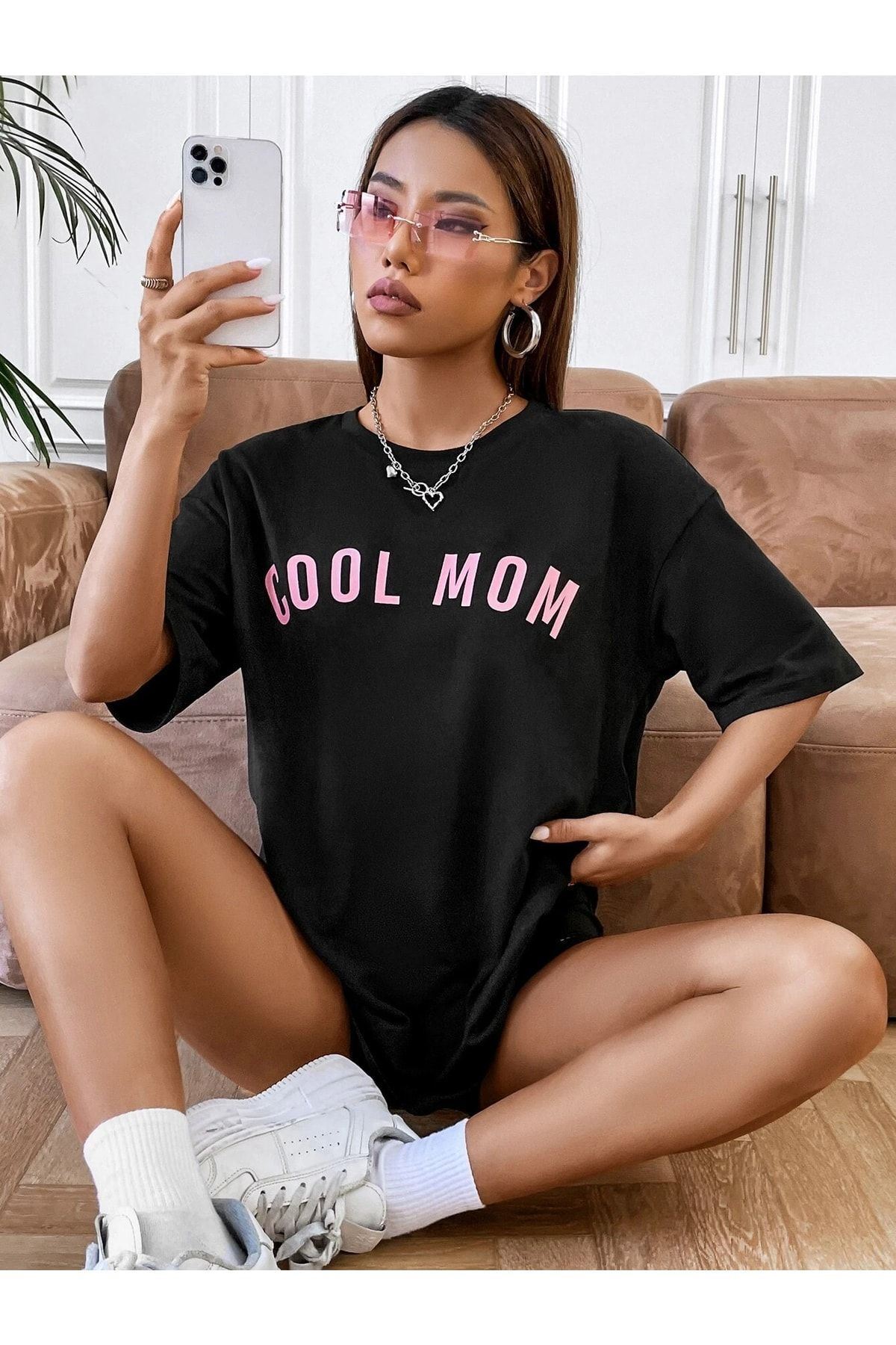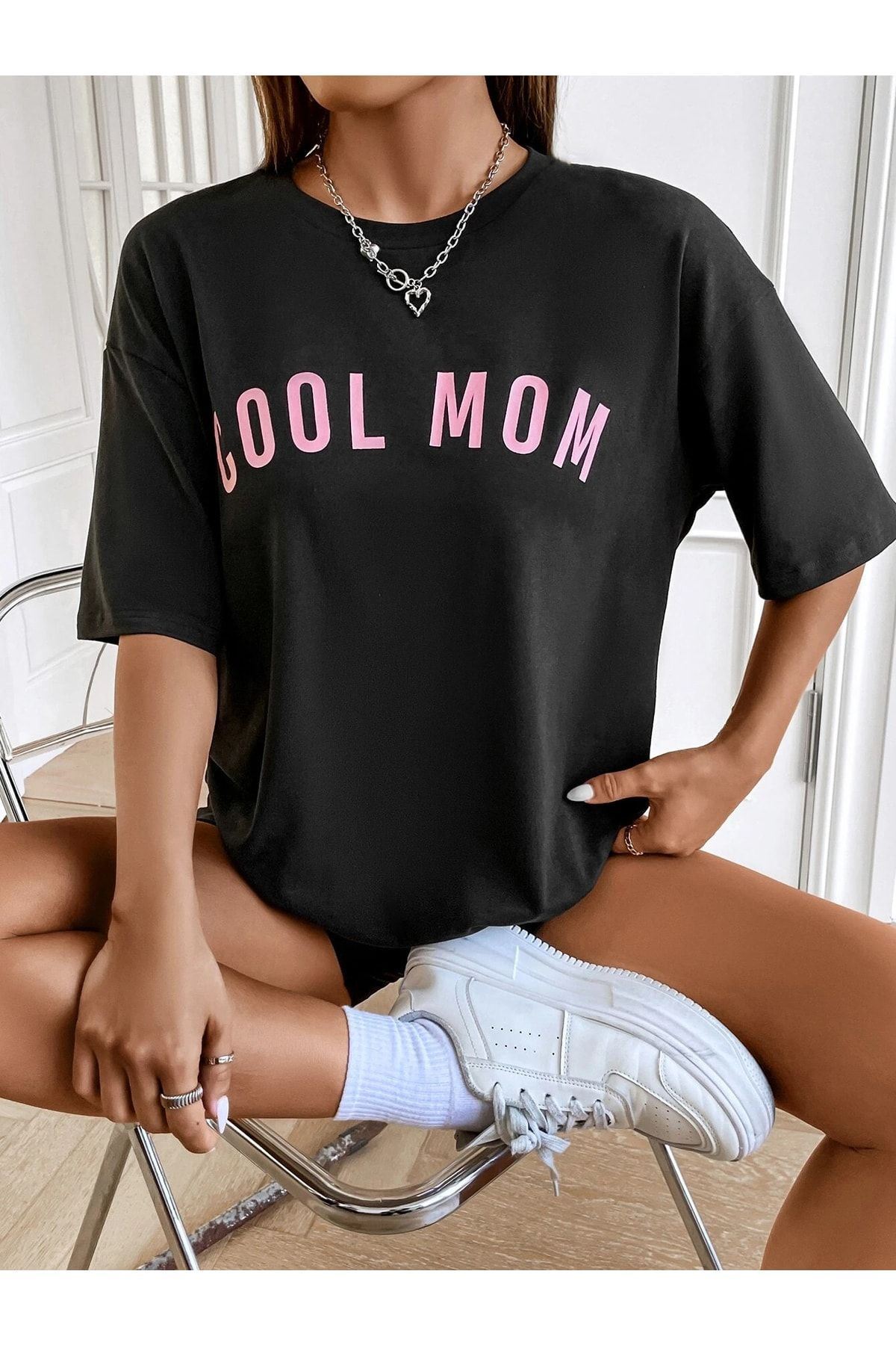 Cool Mom T-shirt - Siyah Baskılı Oversize Bisiklet Yaka Kısa Kol Tişört