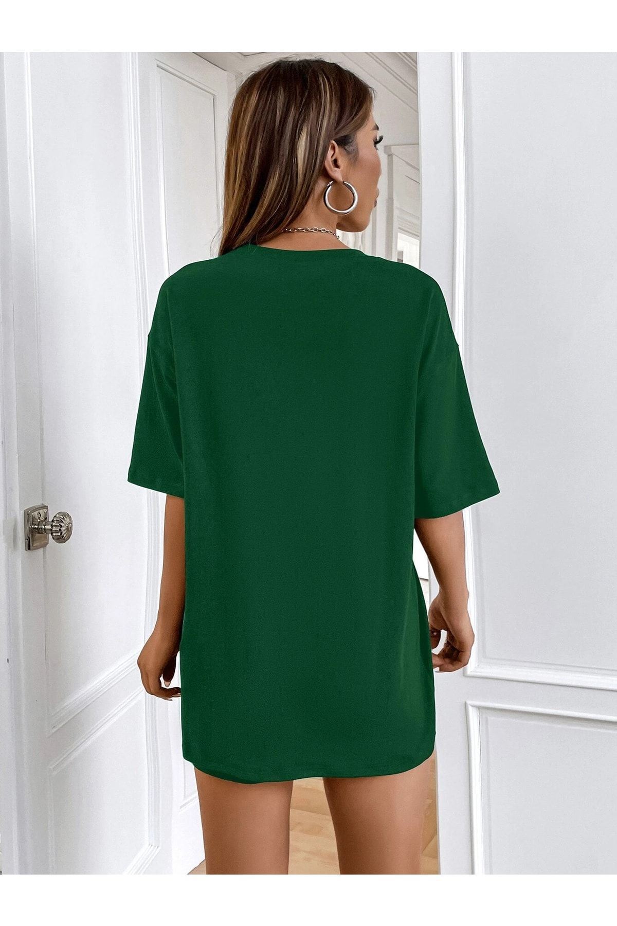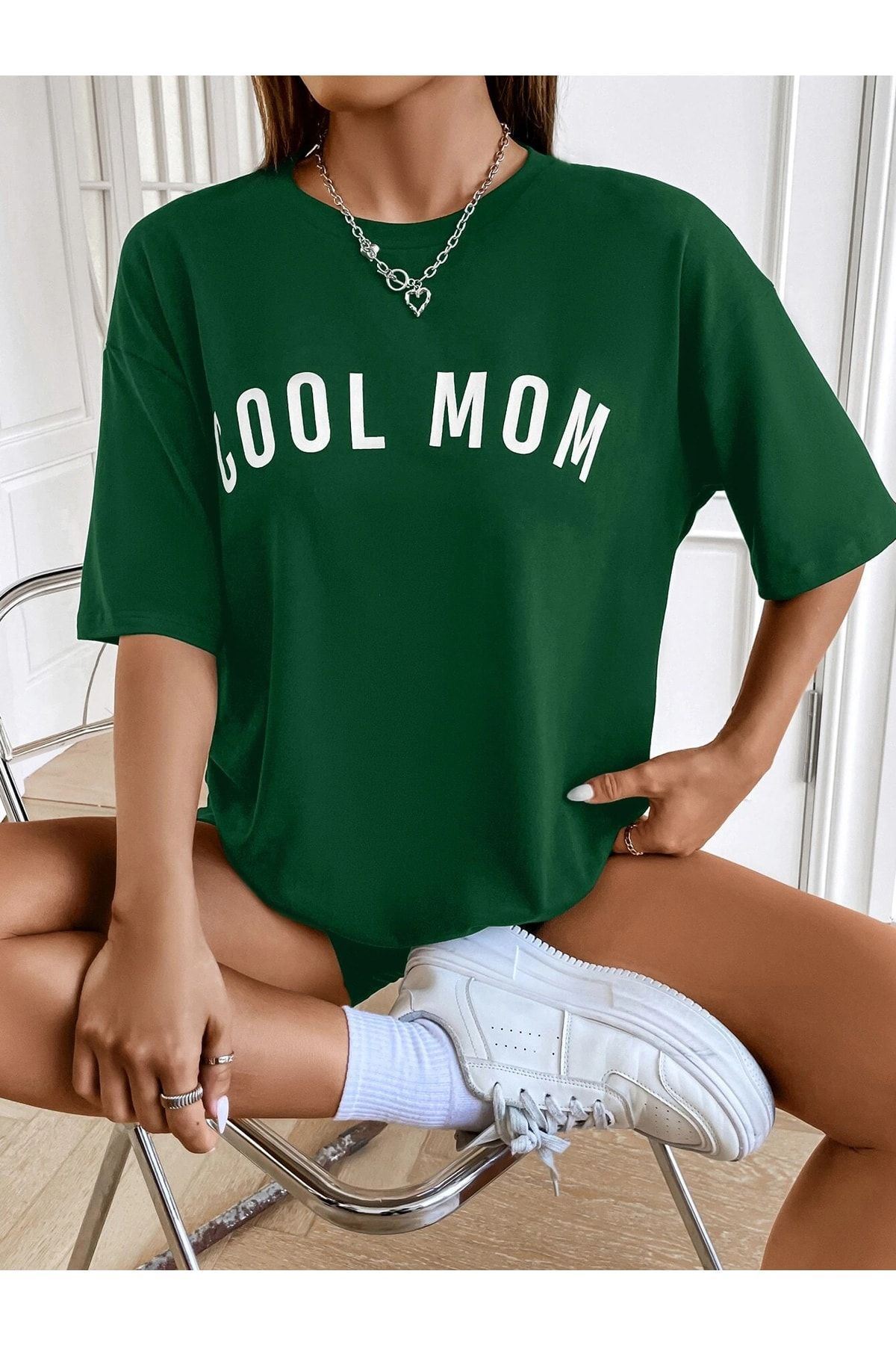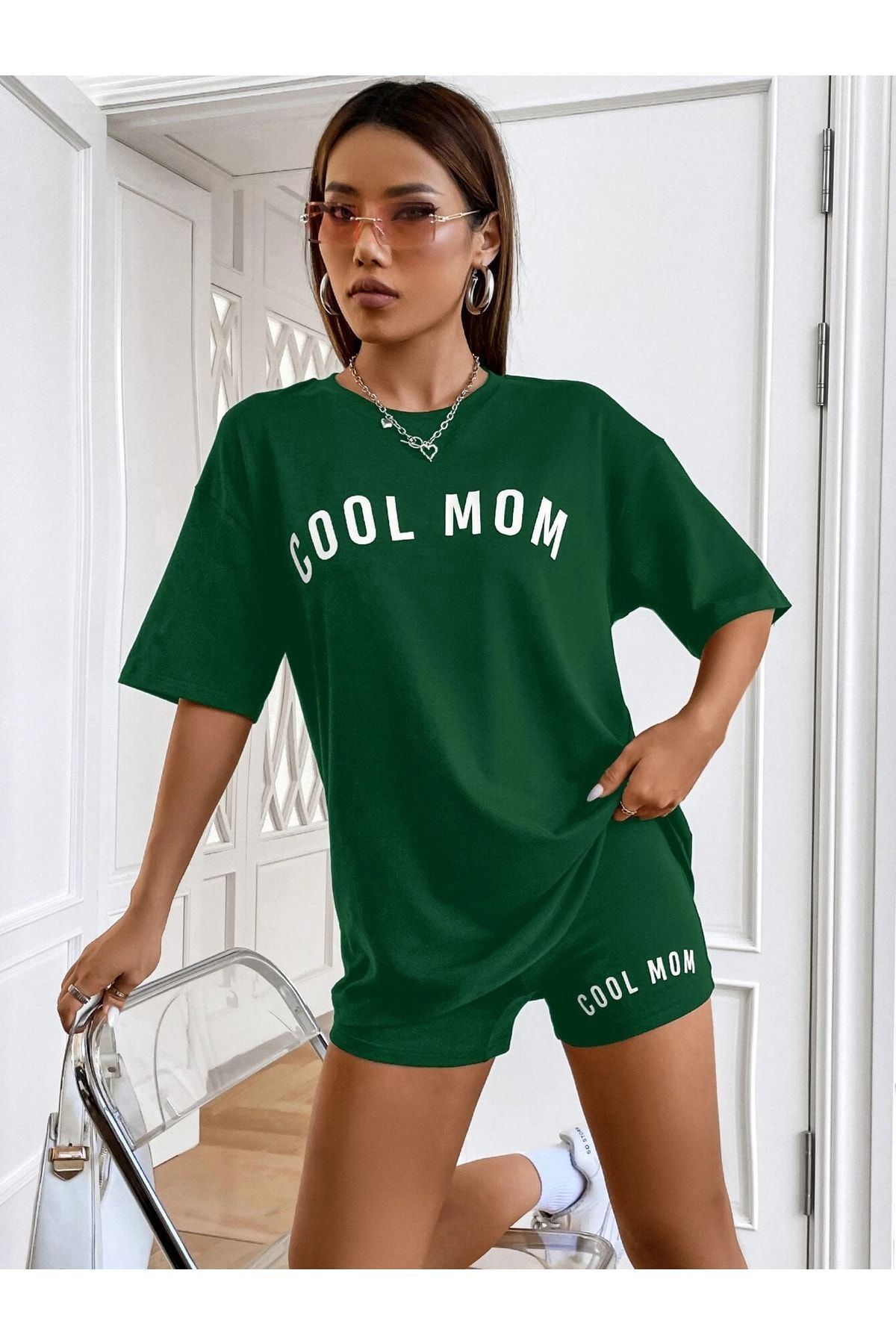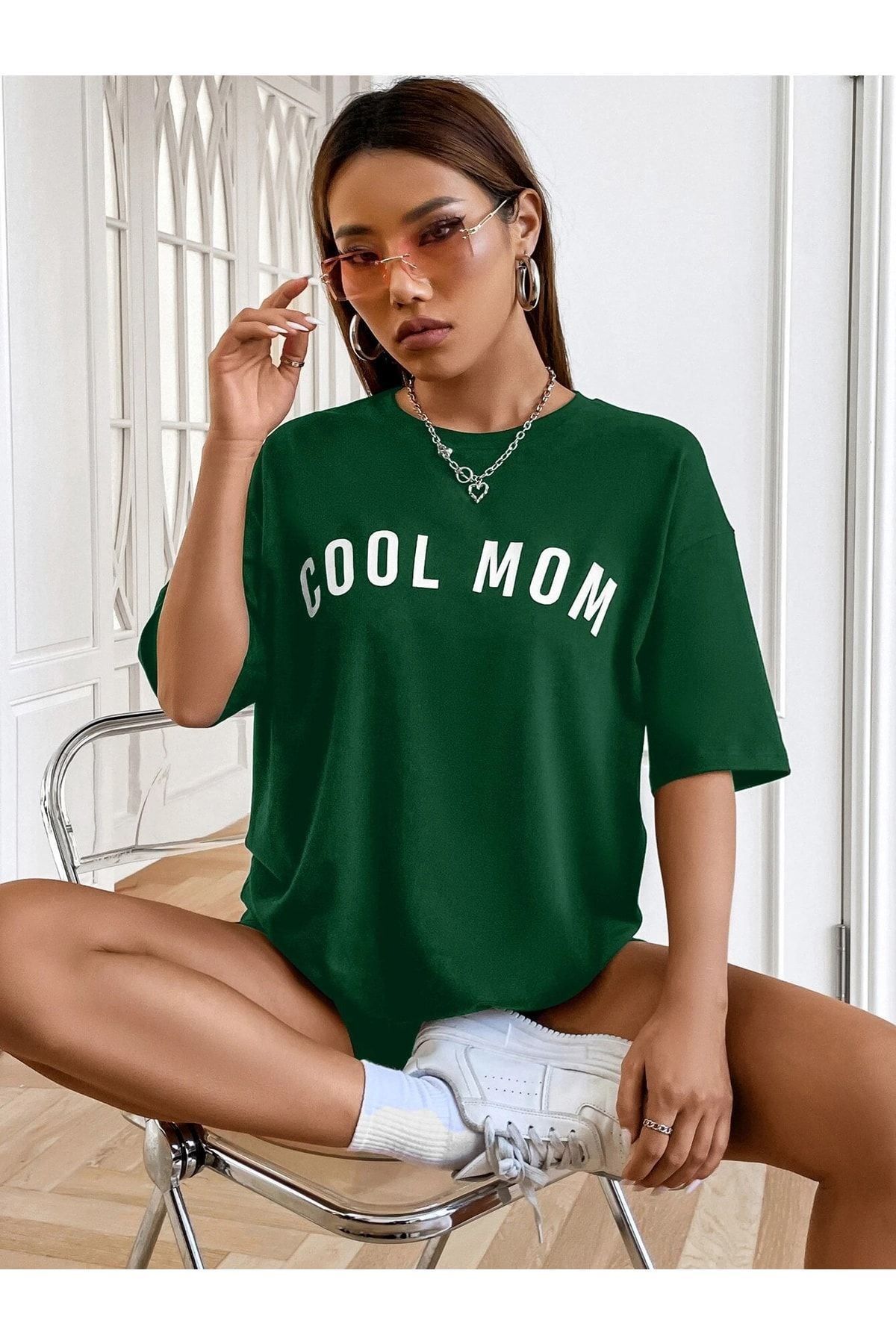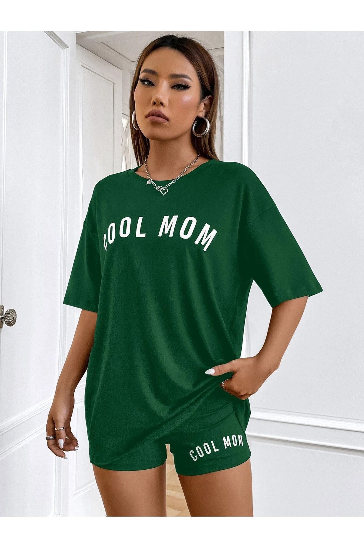 Cool Mom T-shirt - Yeşil Baskılı Oversize Bisiklet Yaka Kısa Kol Tişört