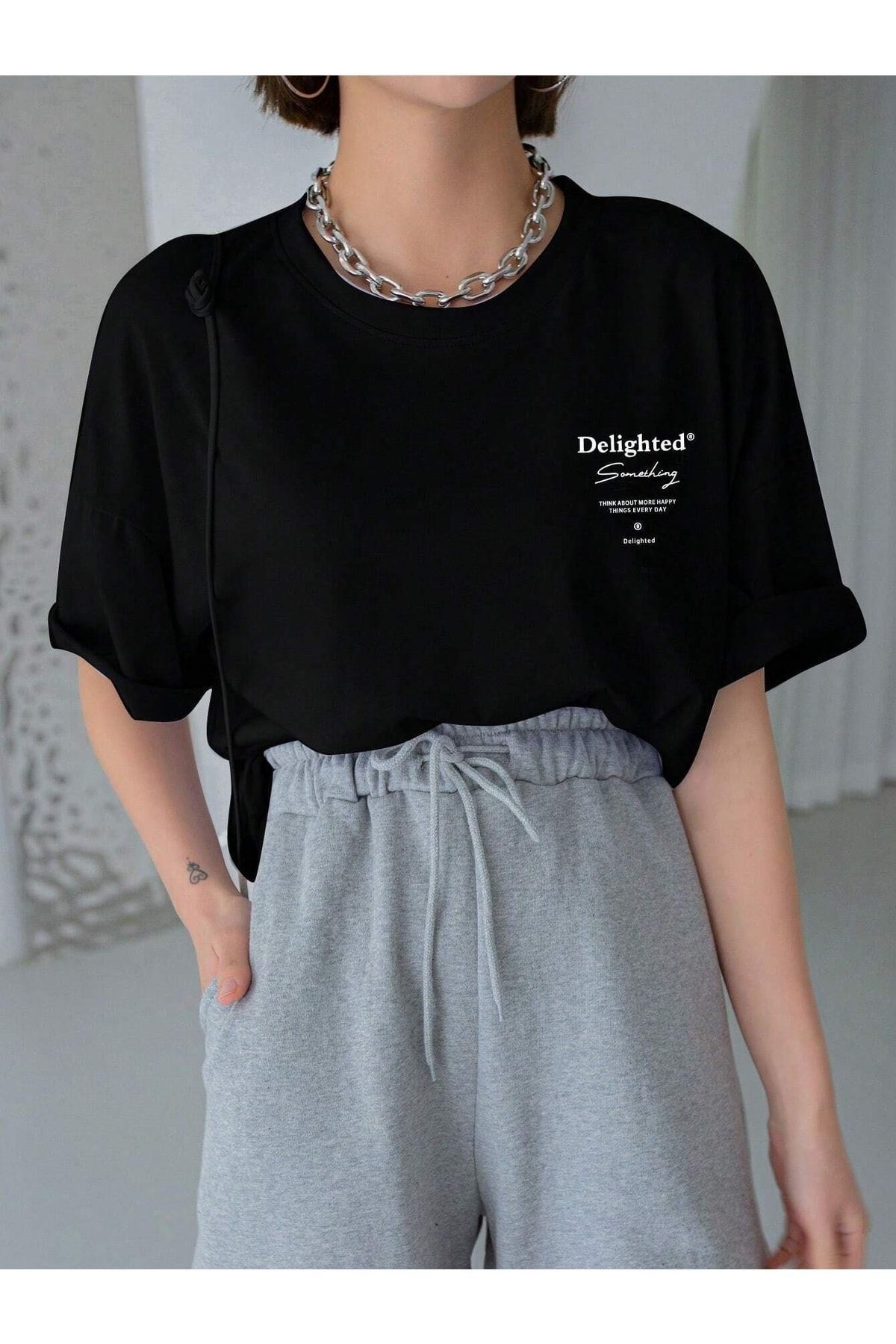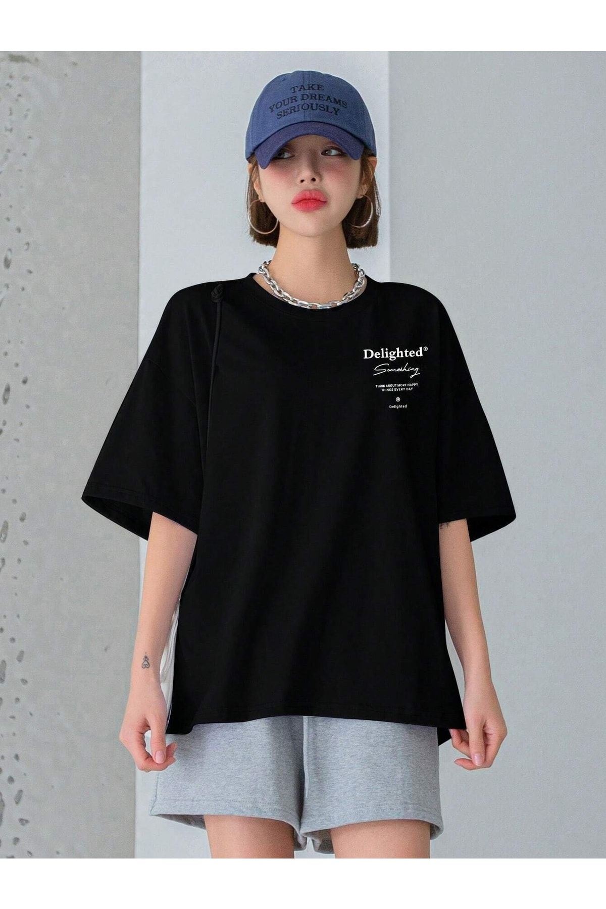 Delighted T-shirt - Siyah Baskılı Oversize Bisiklet Yaka Kısa Kol Tişört