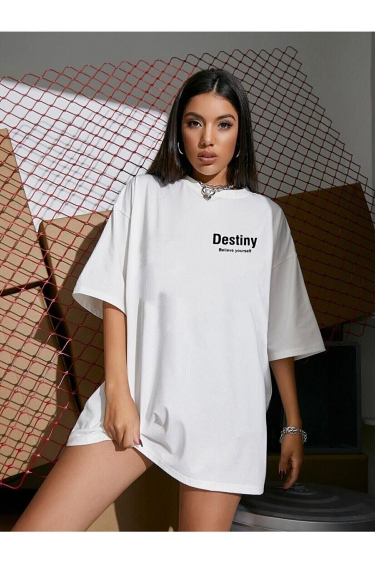 Destiny T-shirt - Beyaz Baskılı Oversize Bisiklet Yaka Kısa Kol Tişört