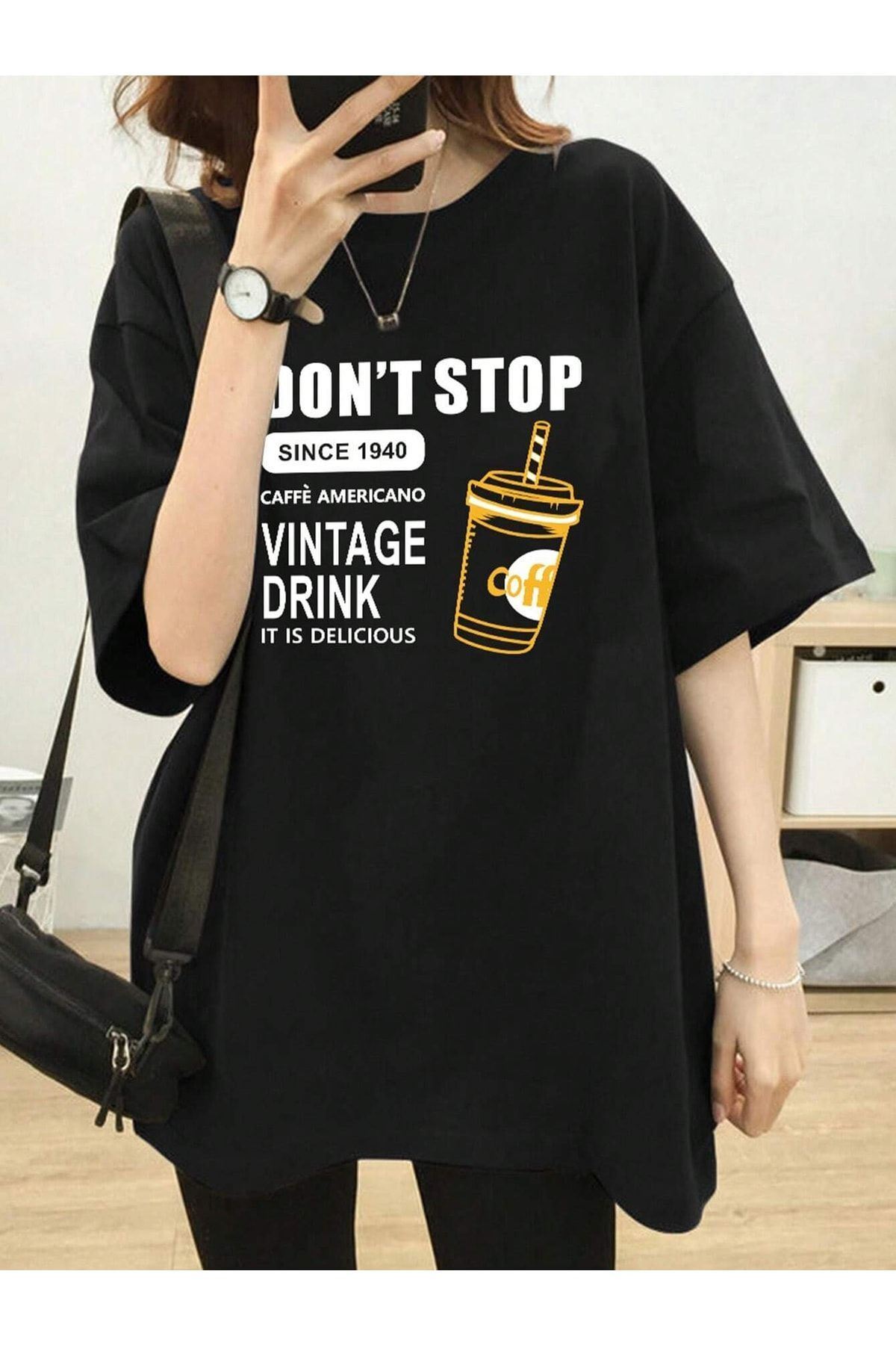Dont Stop T-shirt - Siyah Baskılı Oversize Bisiklet Yaka Kısa Kol Tişört