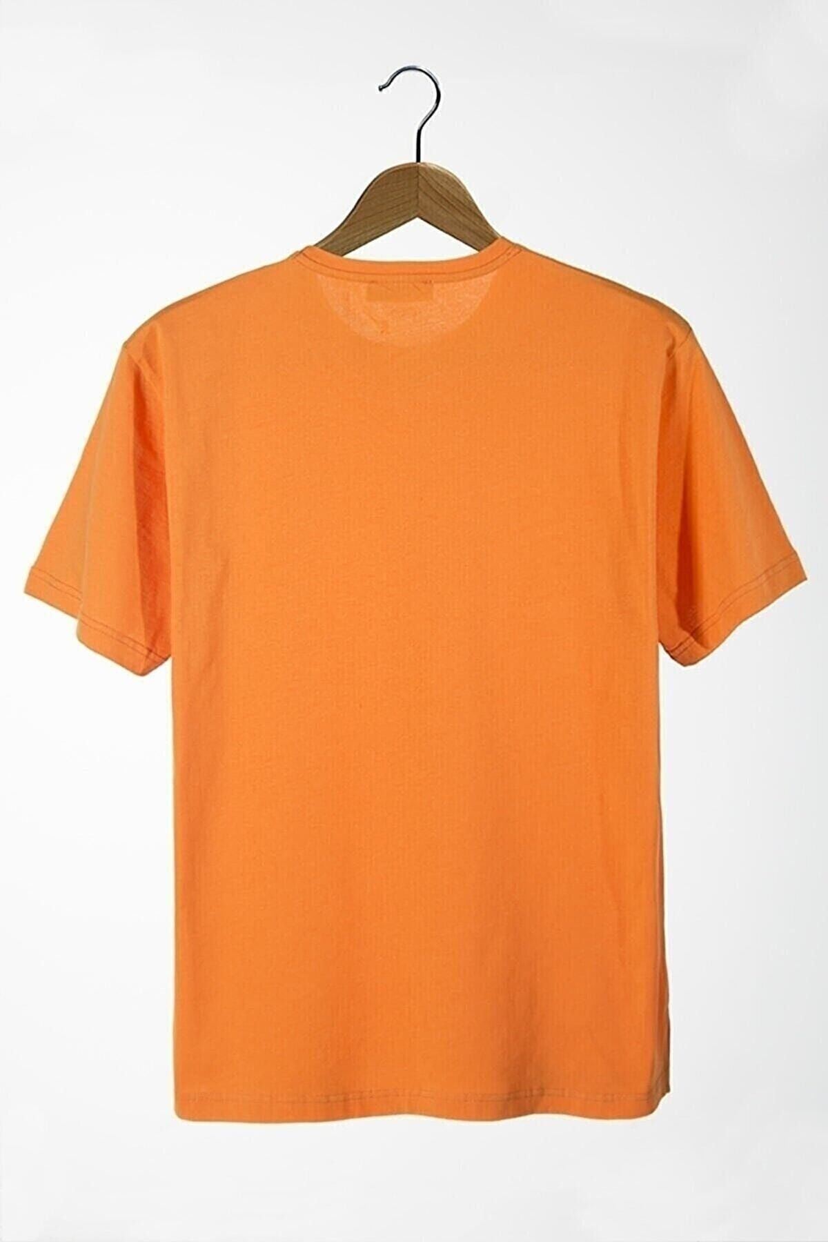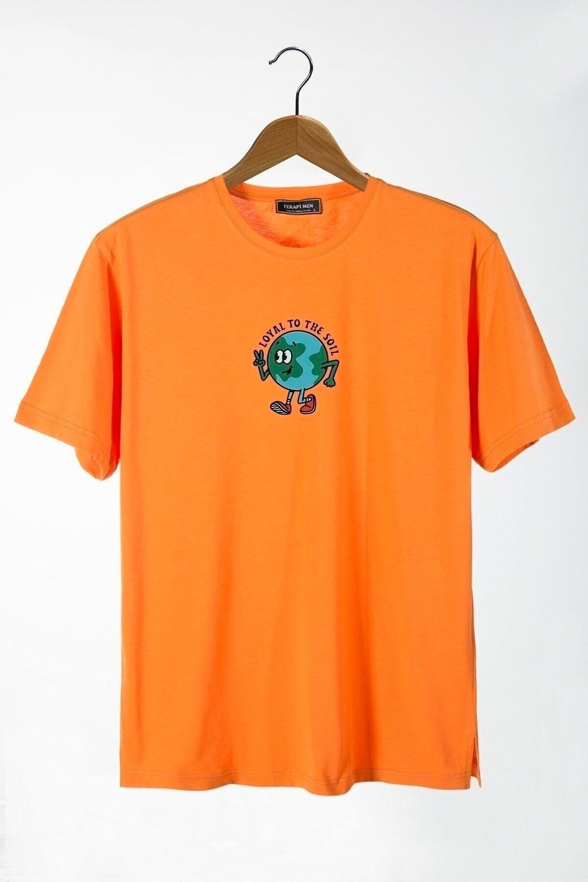Dünya T-shirt - Turuncu Baskılı Oversize Bisiklet Yaka Kısa Kol Tişört