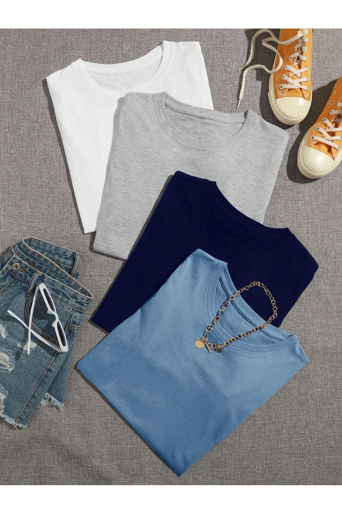 Düz Basic 4'lü Çoklu Kombin T-shirt - Beyaz Gri Lacivert Ve Bebe Mavi Oversize Bisiklet Yaka
