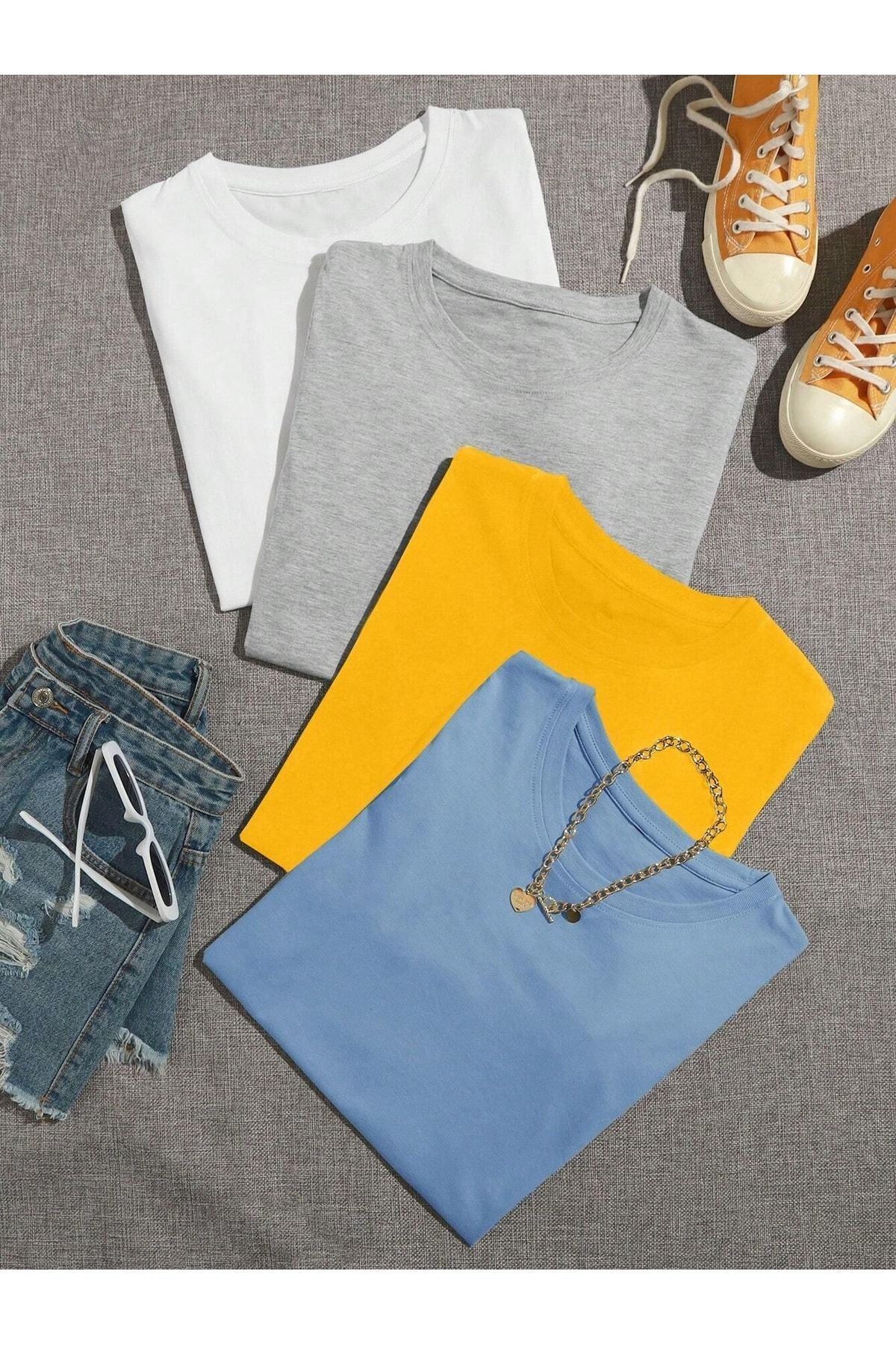Düz Basic 4'lü Çoklu Kombin T-shirt - Beyaz Gri Sarı Ve Bebe Mavi Oversize Bisiklet Yaka
