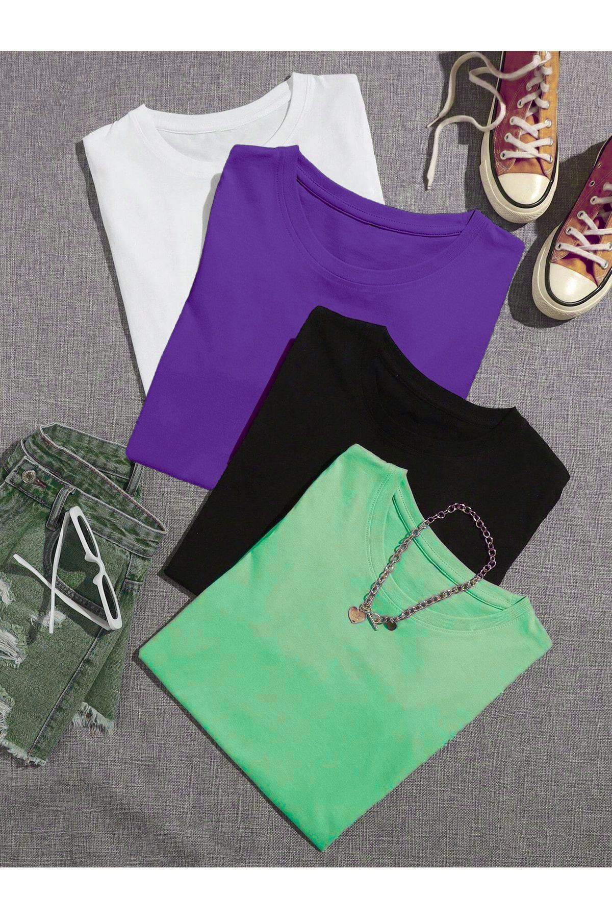 Düz Basic 4'lü Çoklu Kombin T-shirt - Beyaz Mor Siyah Ve Su Yeşili Oversize Bisiklet Yaka