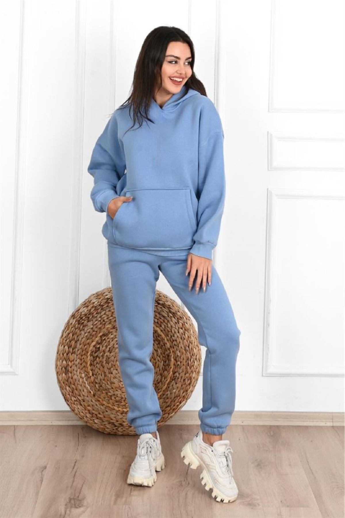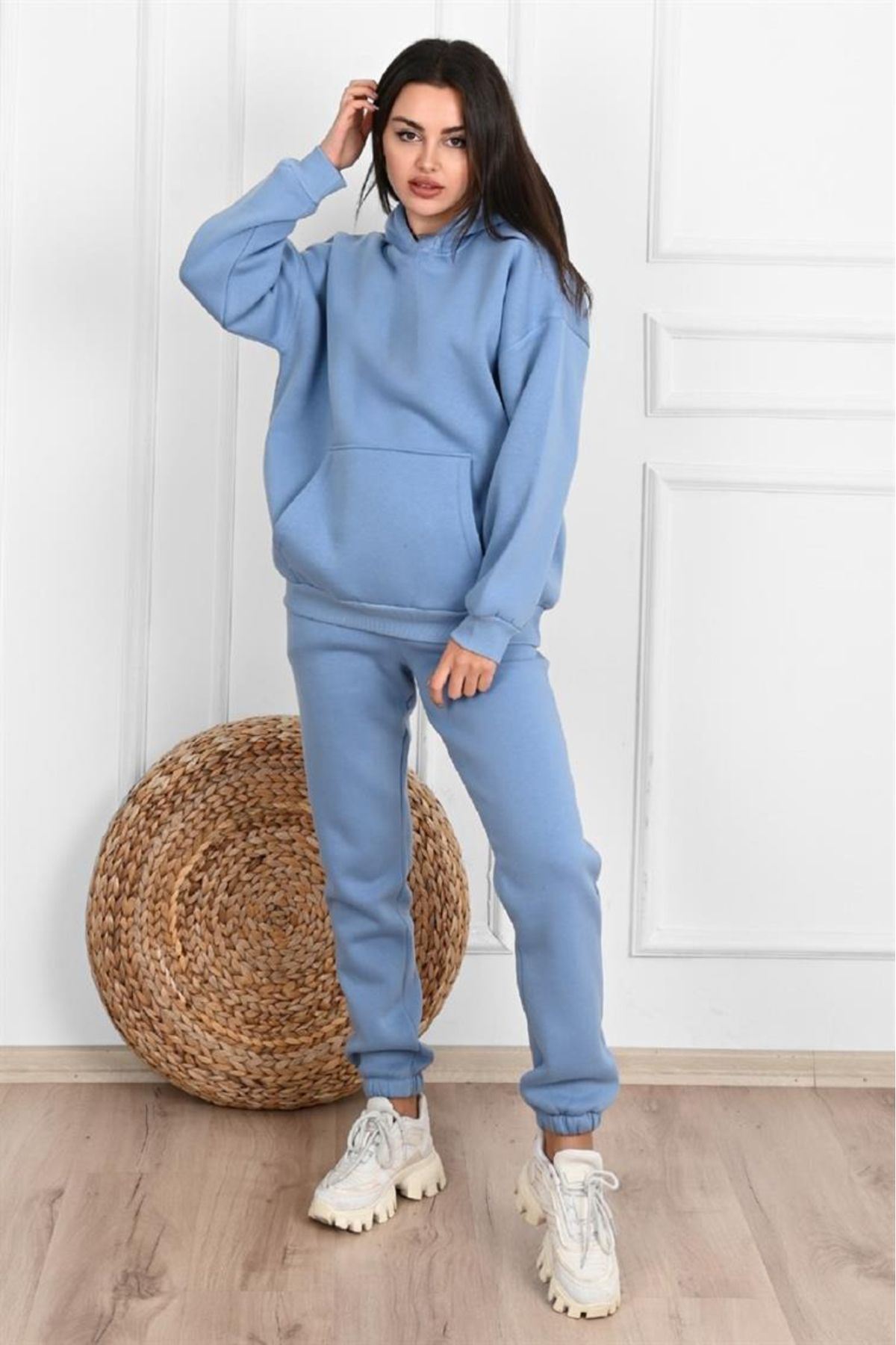 Düz Basic Eşofman Takımı Sweatshirt Jogger - Bebe Mavisi Oversize Şardonlu Kapüşonlu