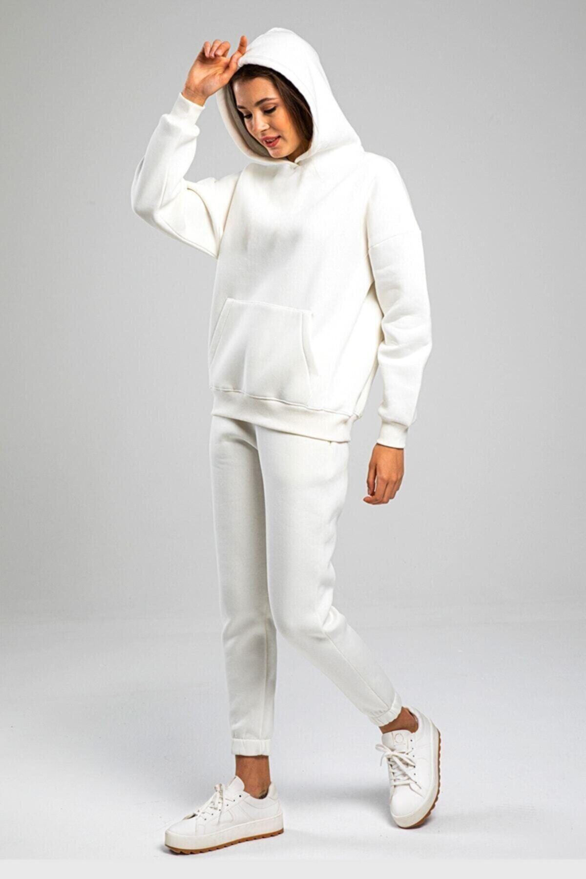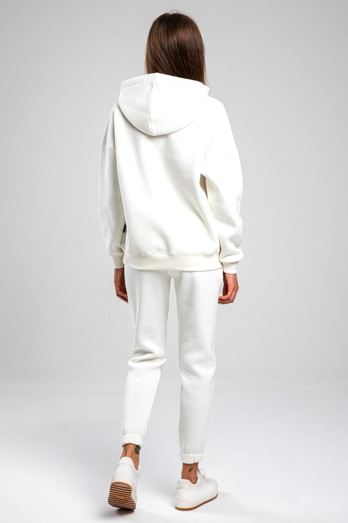Düz Basic Eşofman Takımı Sweatshirt Jogger - Beyaz Oversize Şardonlu Kapüşonlu