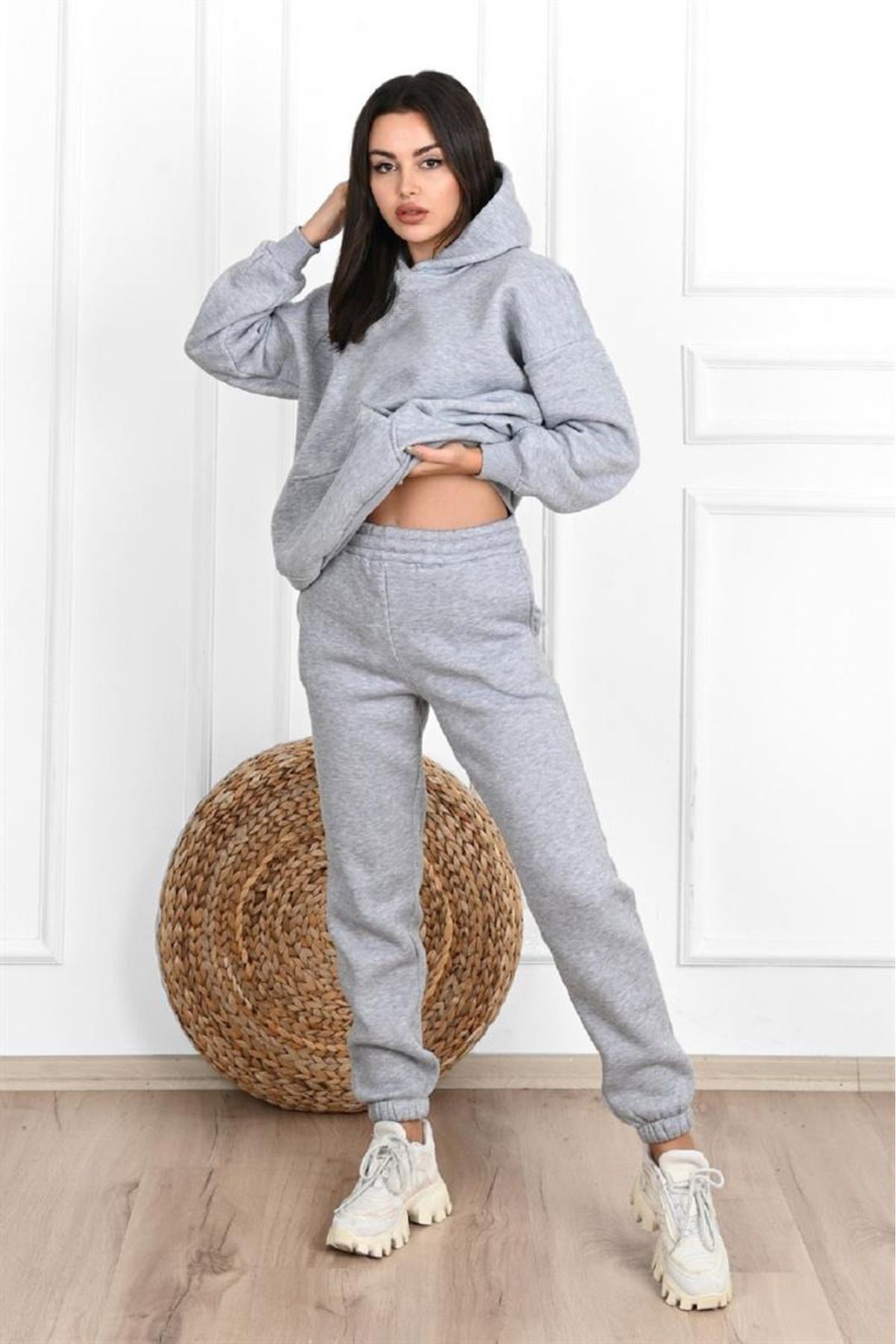 Düz Basic Eşofman Takımı Sweatshirt Jogger - Gri Oversize Şardonlu Kapüşonlu