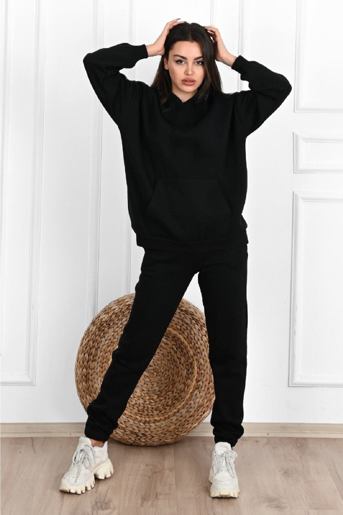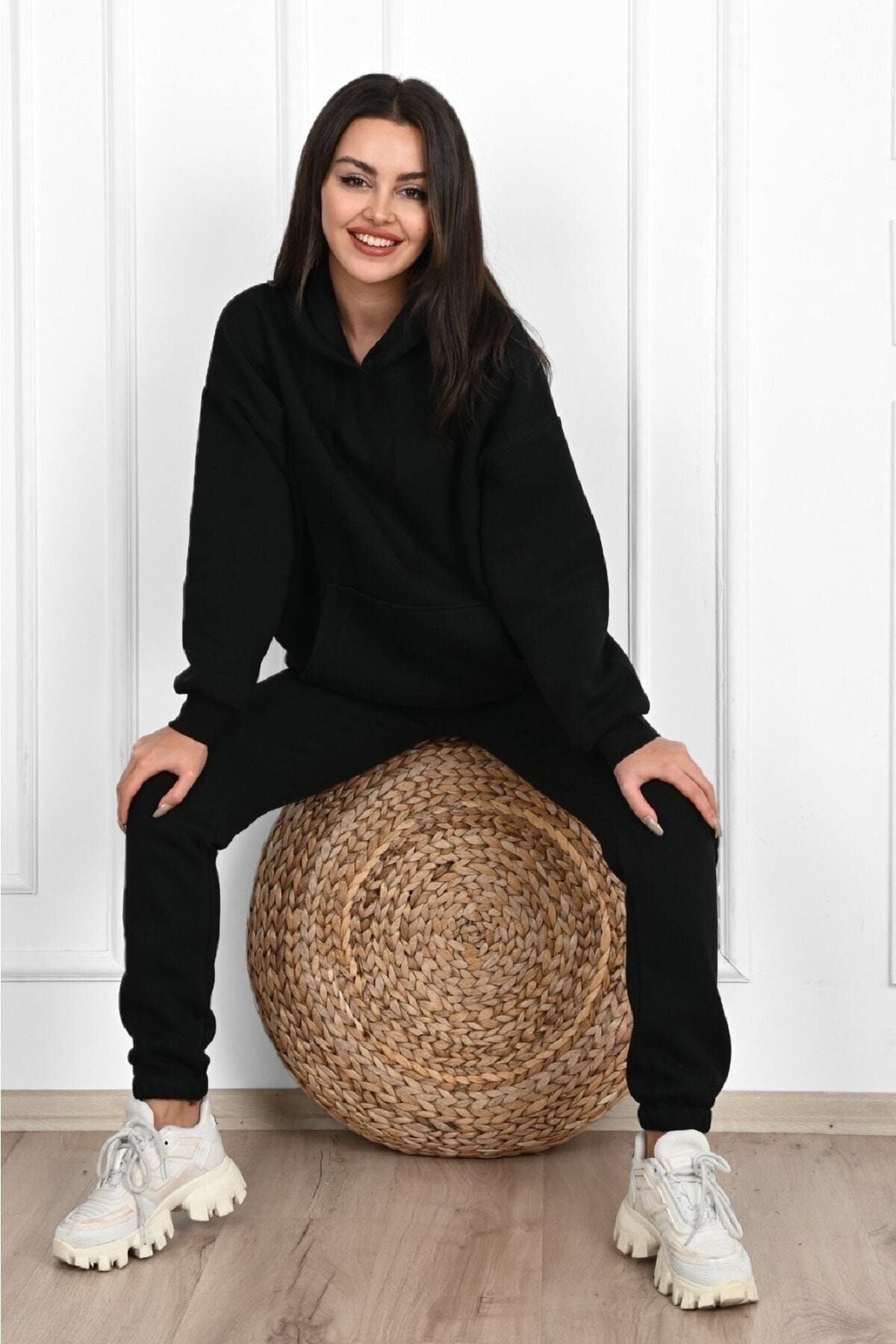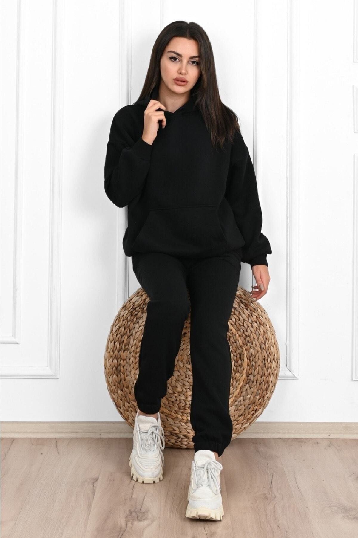 Düz Basic Eşofman Takımı Sweatshirt Jogger - Siyah Oversize Şardonlu Kapüşonlu