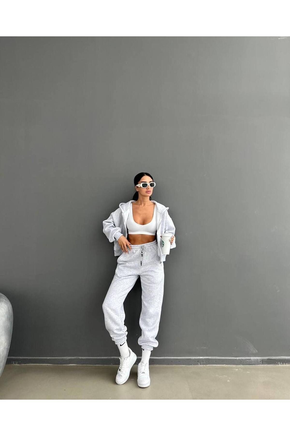 Düz Basic Hırka Eşofman Altı Jogger Alt Üst Takım - Gri Fermuarlı Oversize Kapüşonlu