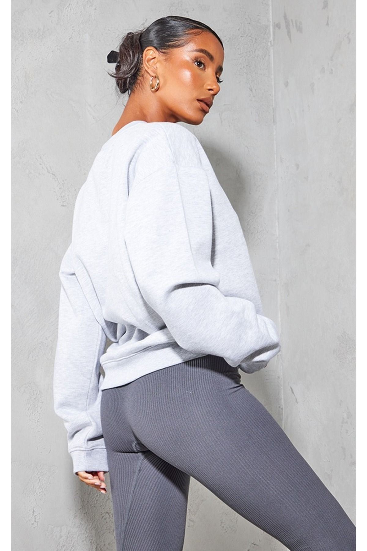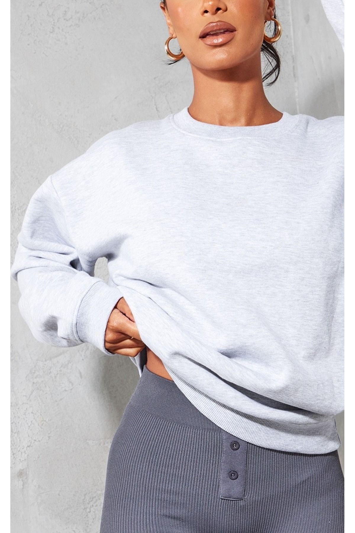 Düz Basic Sweatshirt - Gri Uzun Kol Oversize Bisiklet Yaka