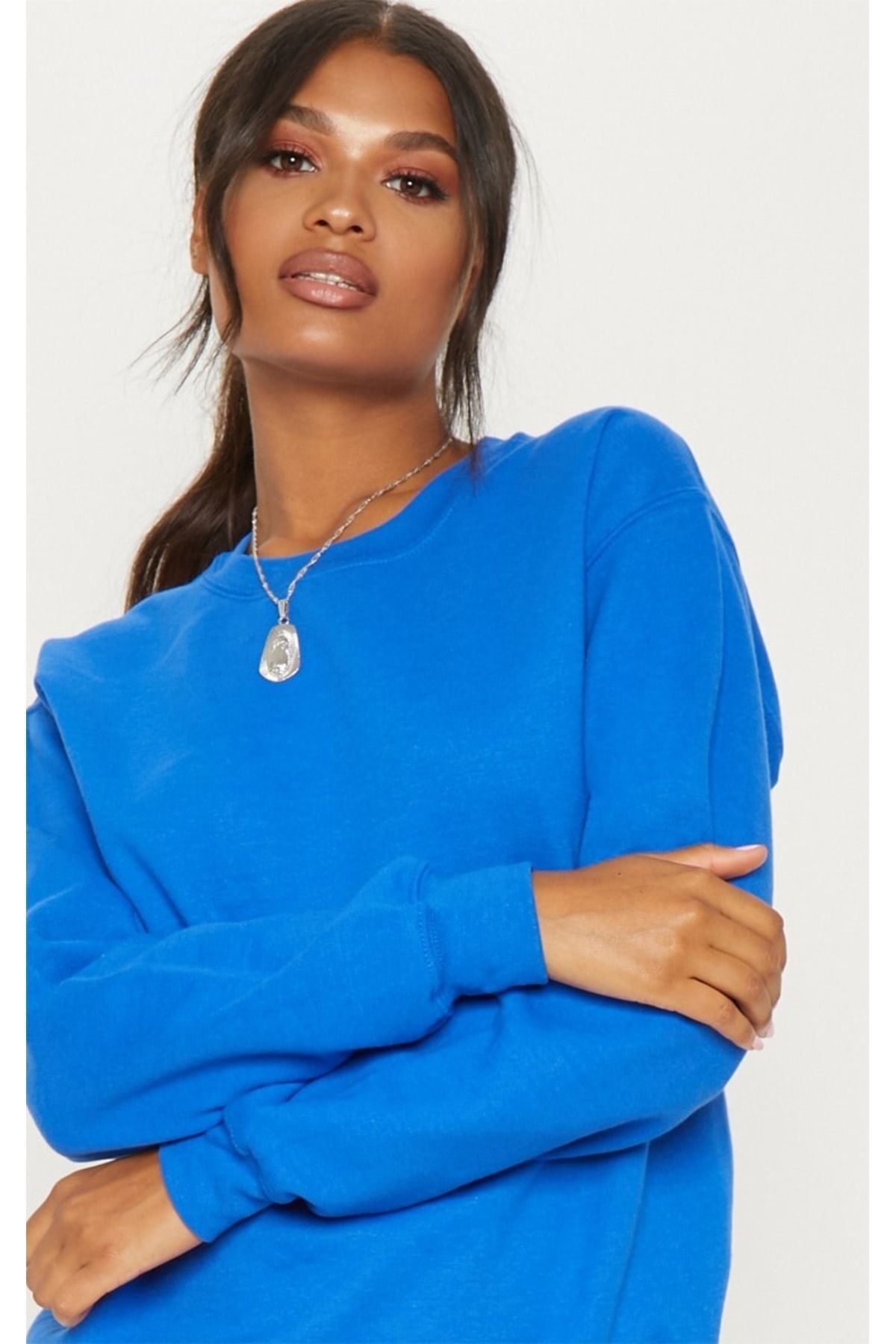 Düz Basic Sweatshirt - Sax Mavi Uzun Kol Oversize Bisiklet Yaka