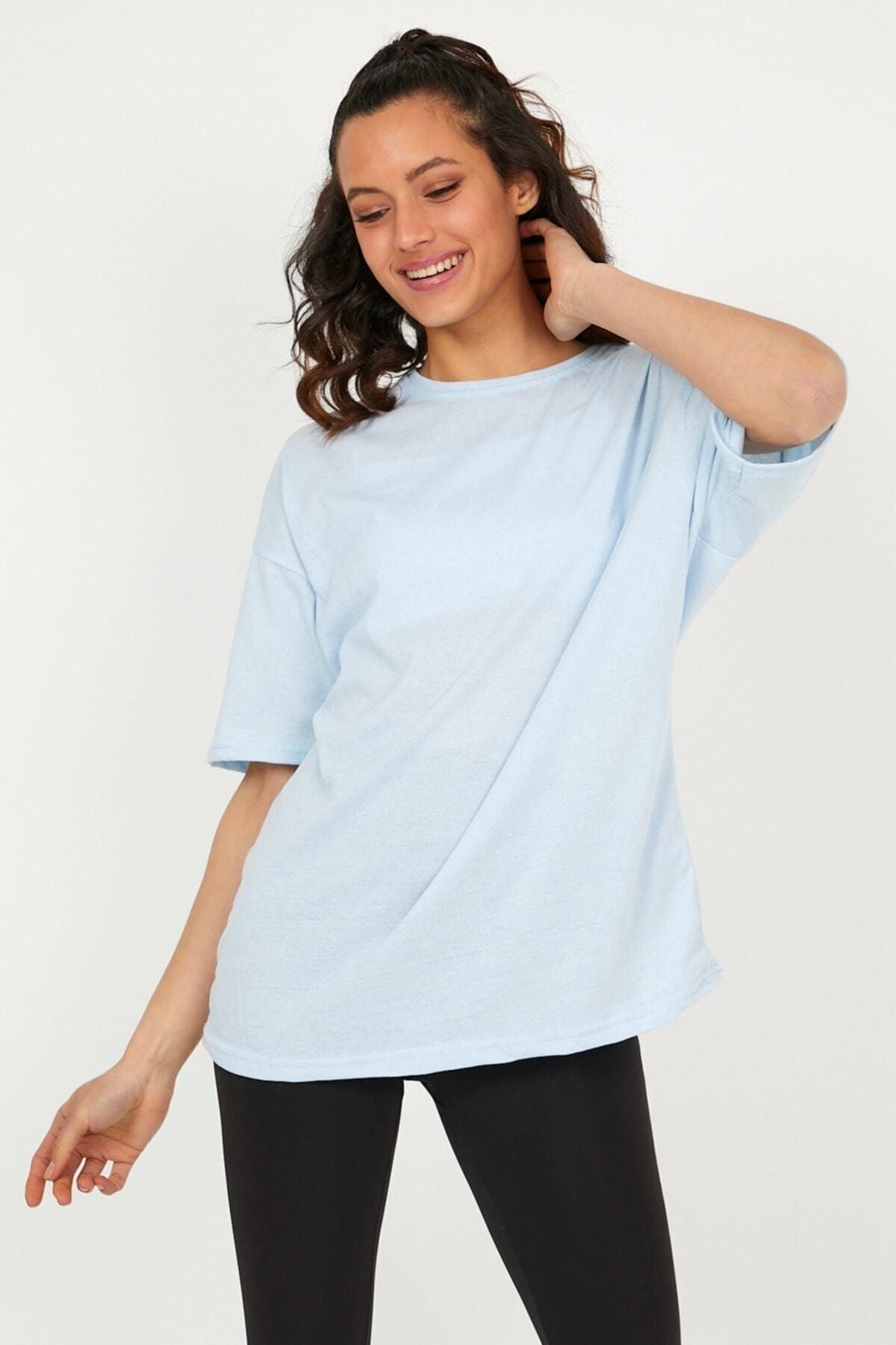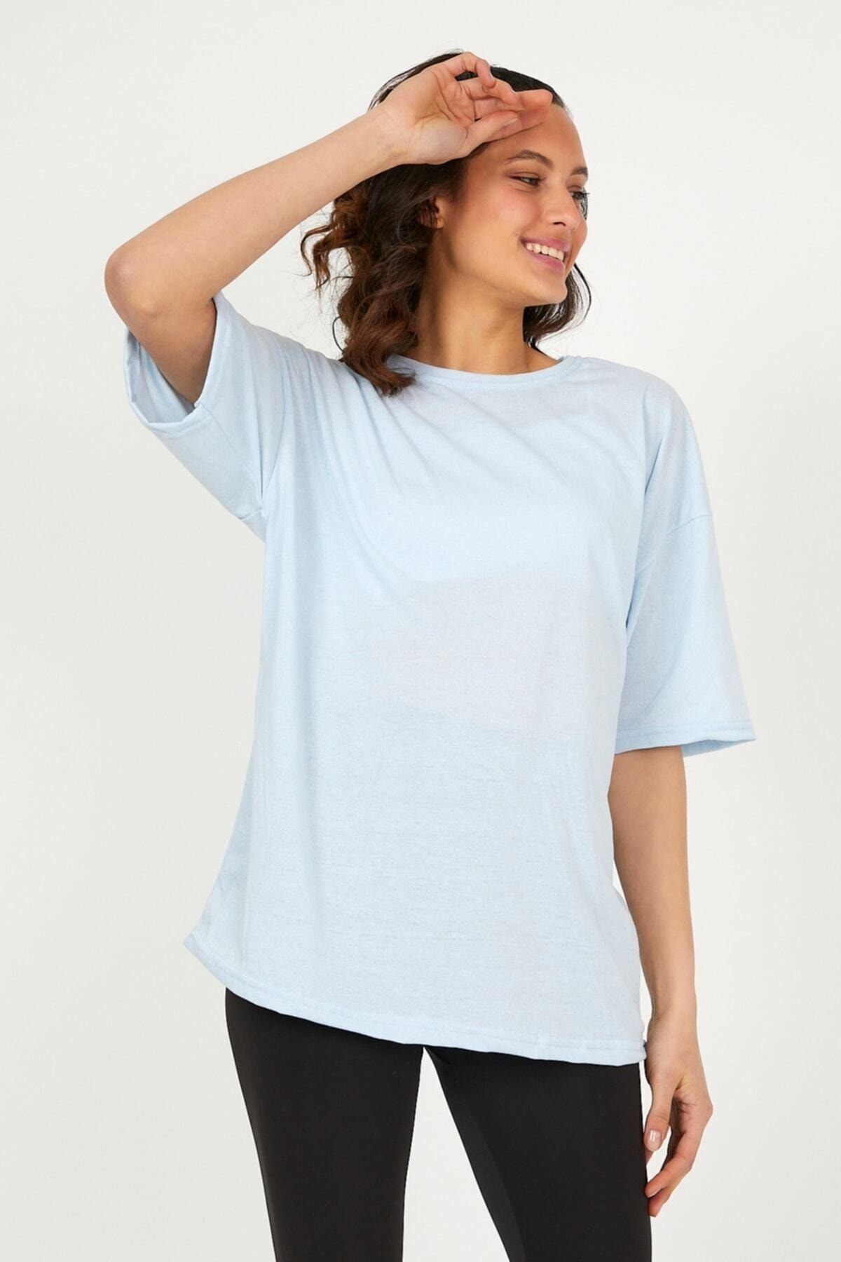 Düz Basic T-shirt - Buz Mavi Oversize Bisiklet Yaka Kısa Kol Tişört