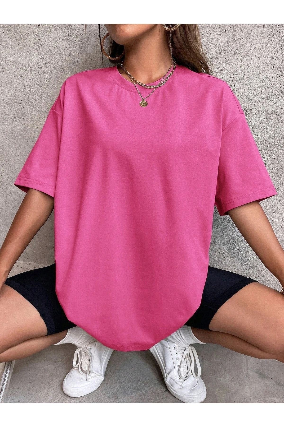 Düz Basic T-Shirt - Pembe Oversize Bisiklet Yaka Kısa Kol