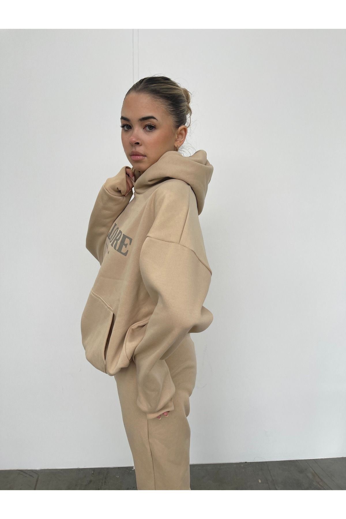 Ellore Australia Eşofman Takımı Sweatshirt Jogger - Bej Baskılı Oversize Şardonlu Kapüşonlu