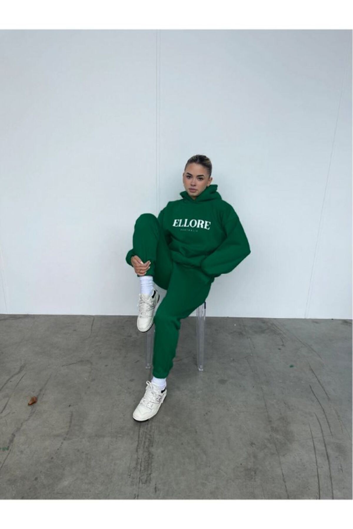 Ellore Australia Eşofman Takımı Sweatshirt Jogger - Yeşil Baskılı Oversize Şardonlu Kapüşonlu
