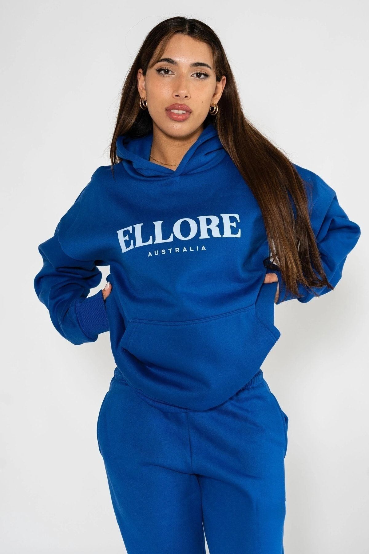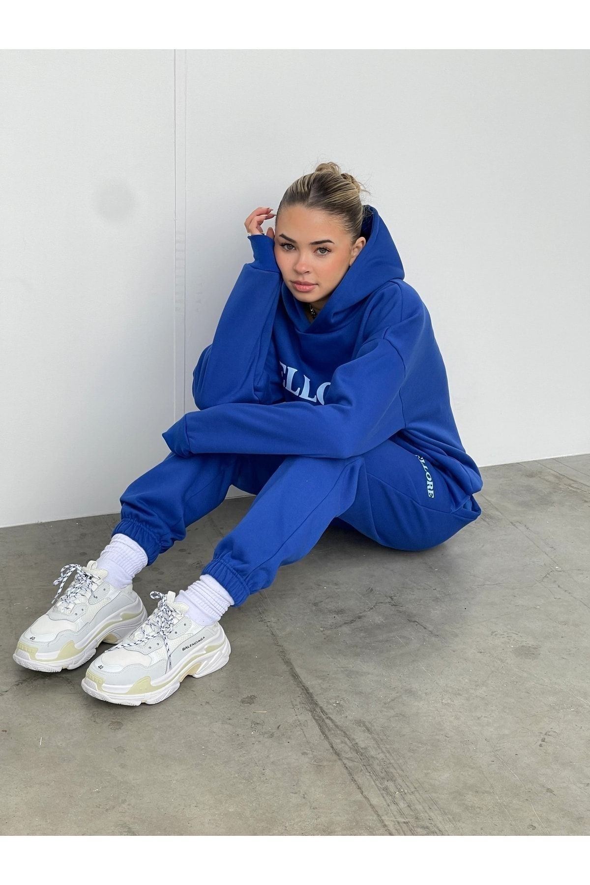 Ellore Eşofman Takımı Sweatshirt Jogger - Sax Mavi Baskılı Oversize Şardonlu Kapüşonlu