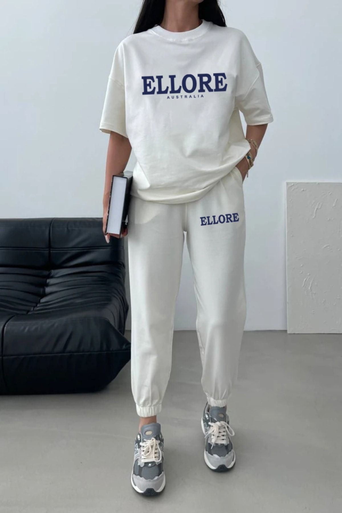 Ellore T-shirt Eşofman Altı Jogger- Beyaz Baskı Alt Üst Eşofman Takımı Oversize Bisiklet Yaka