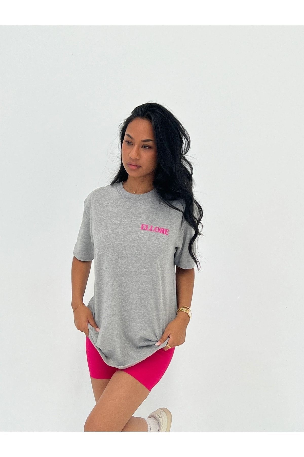 Ellore T-Shirt - Gri Baskılı Oversize Bisiklet Yaka Kısa Kol Tişört