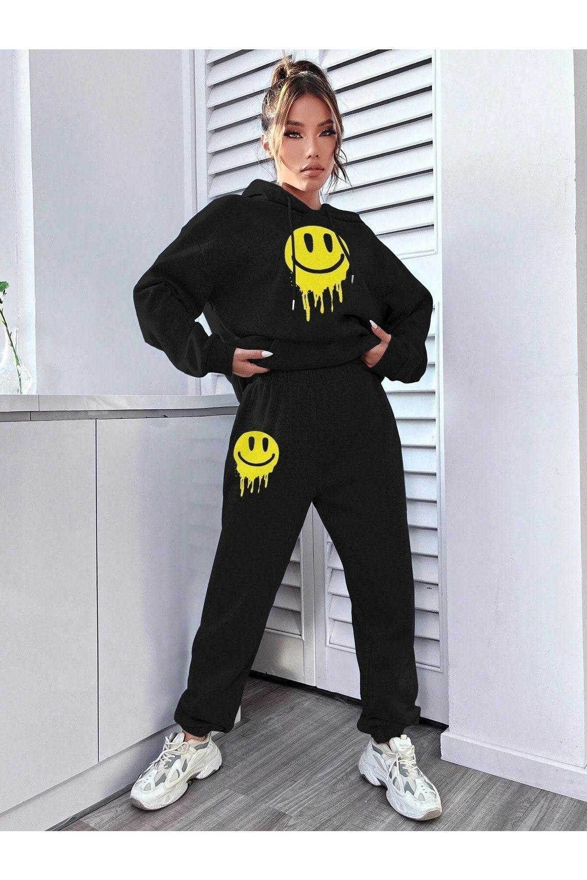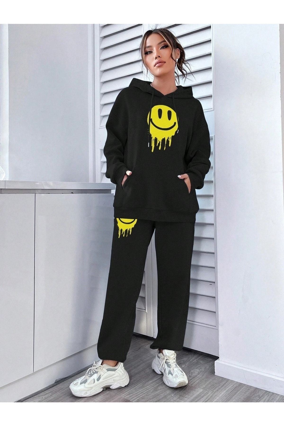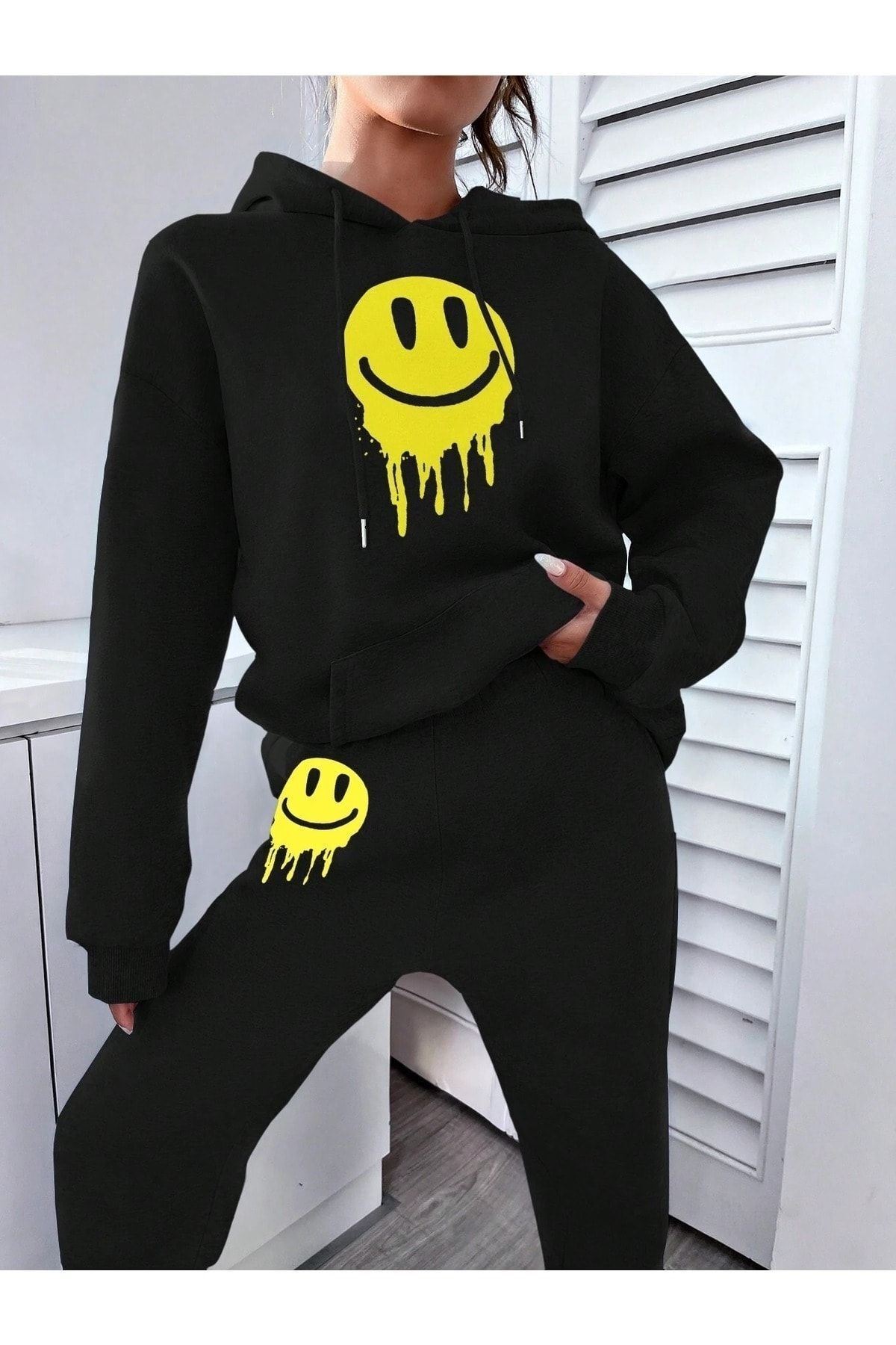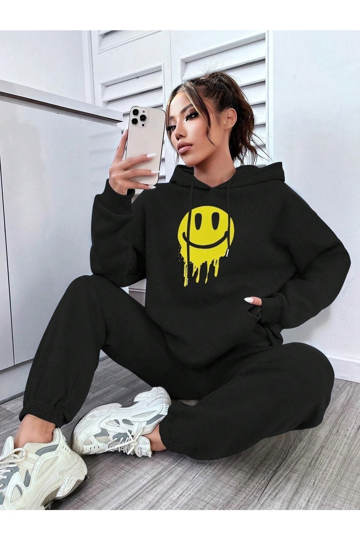 Emoji Eşofman Takımı Sweatshirt Jogger - Siyah Baskılı Oversize Şardonlu Kapüşonlu