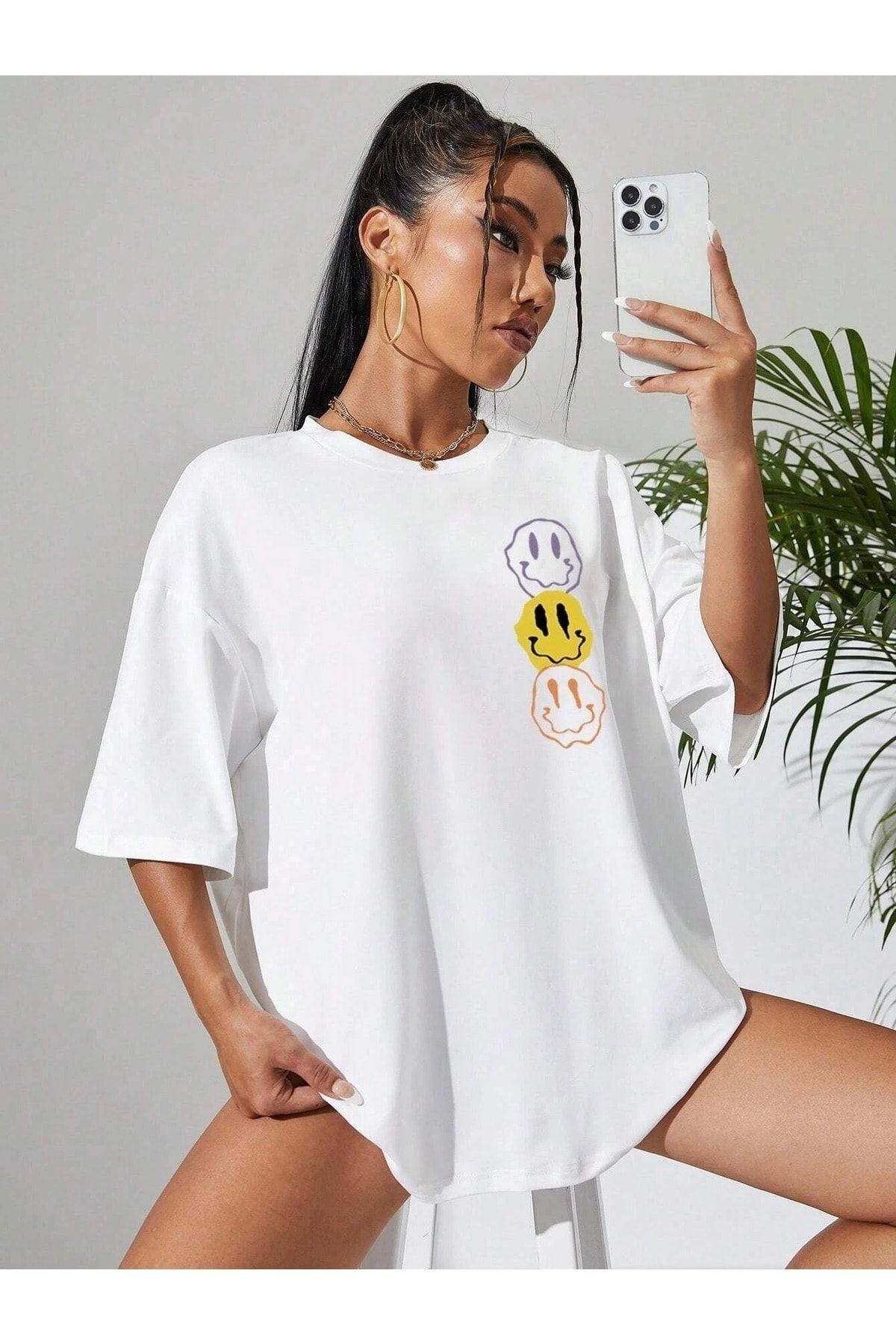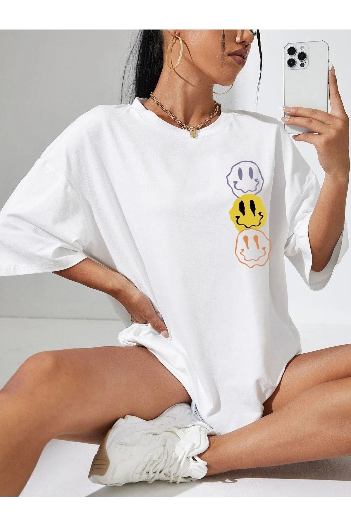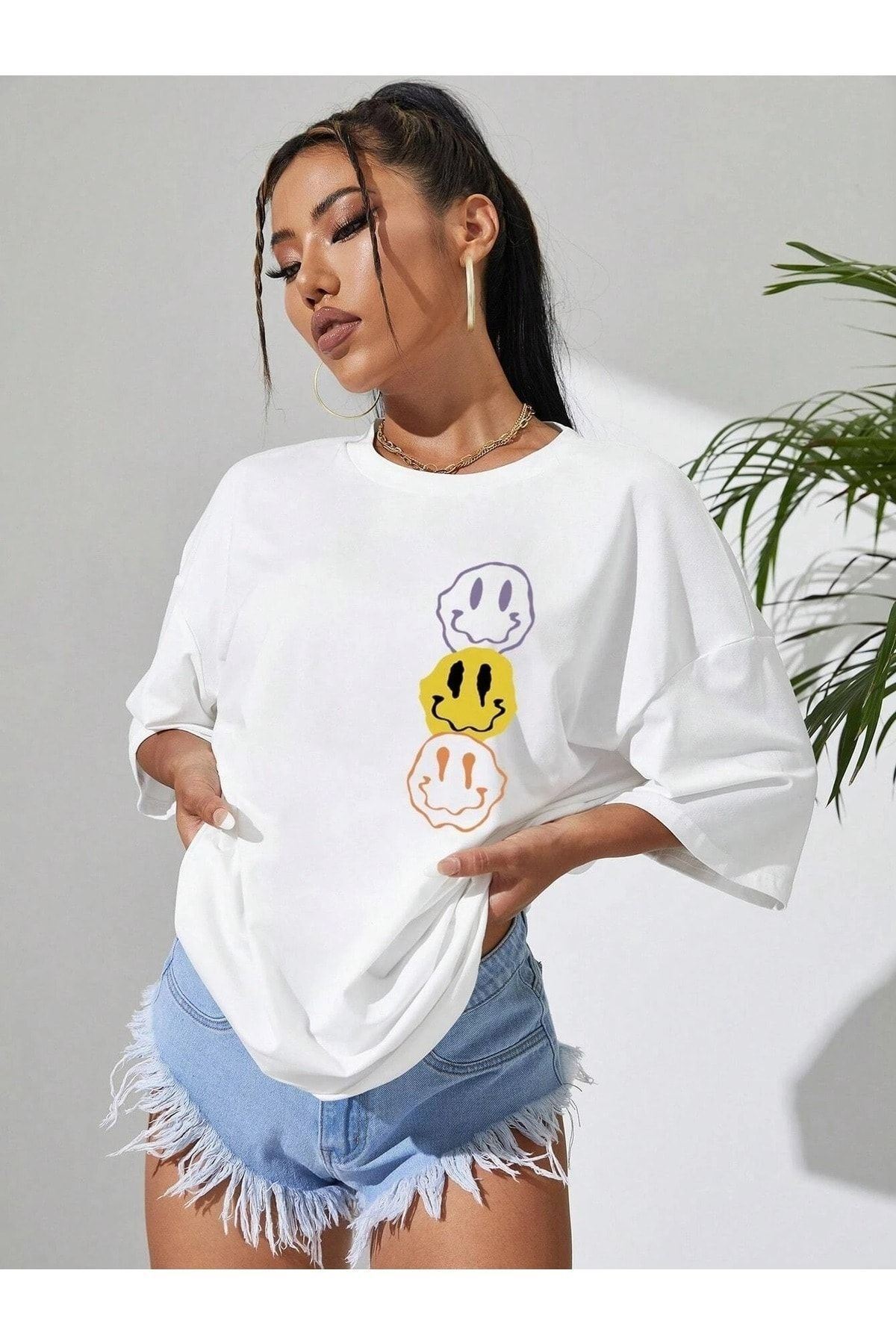 Emoji T-Shirt - Beyaz Baskılı Oversize Bisiklet Yaka Kısa Kol