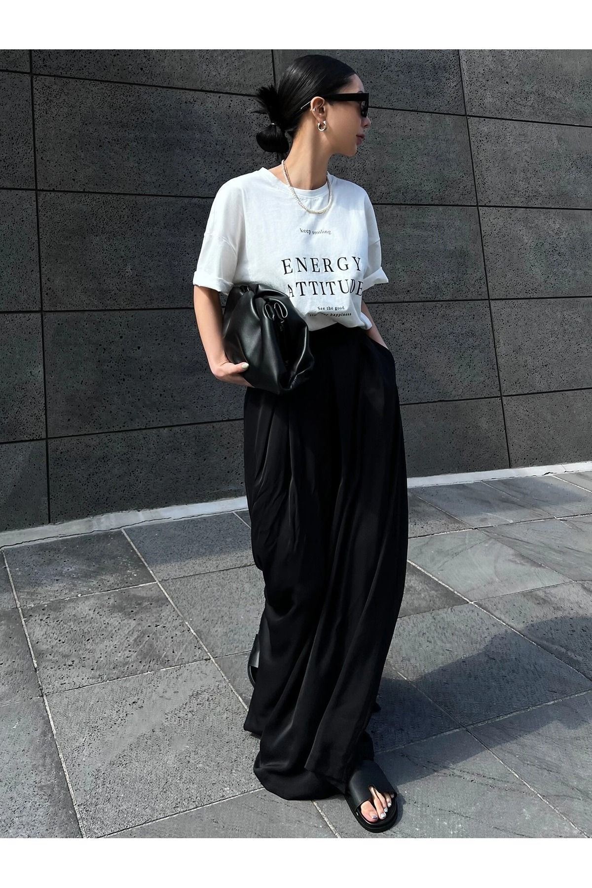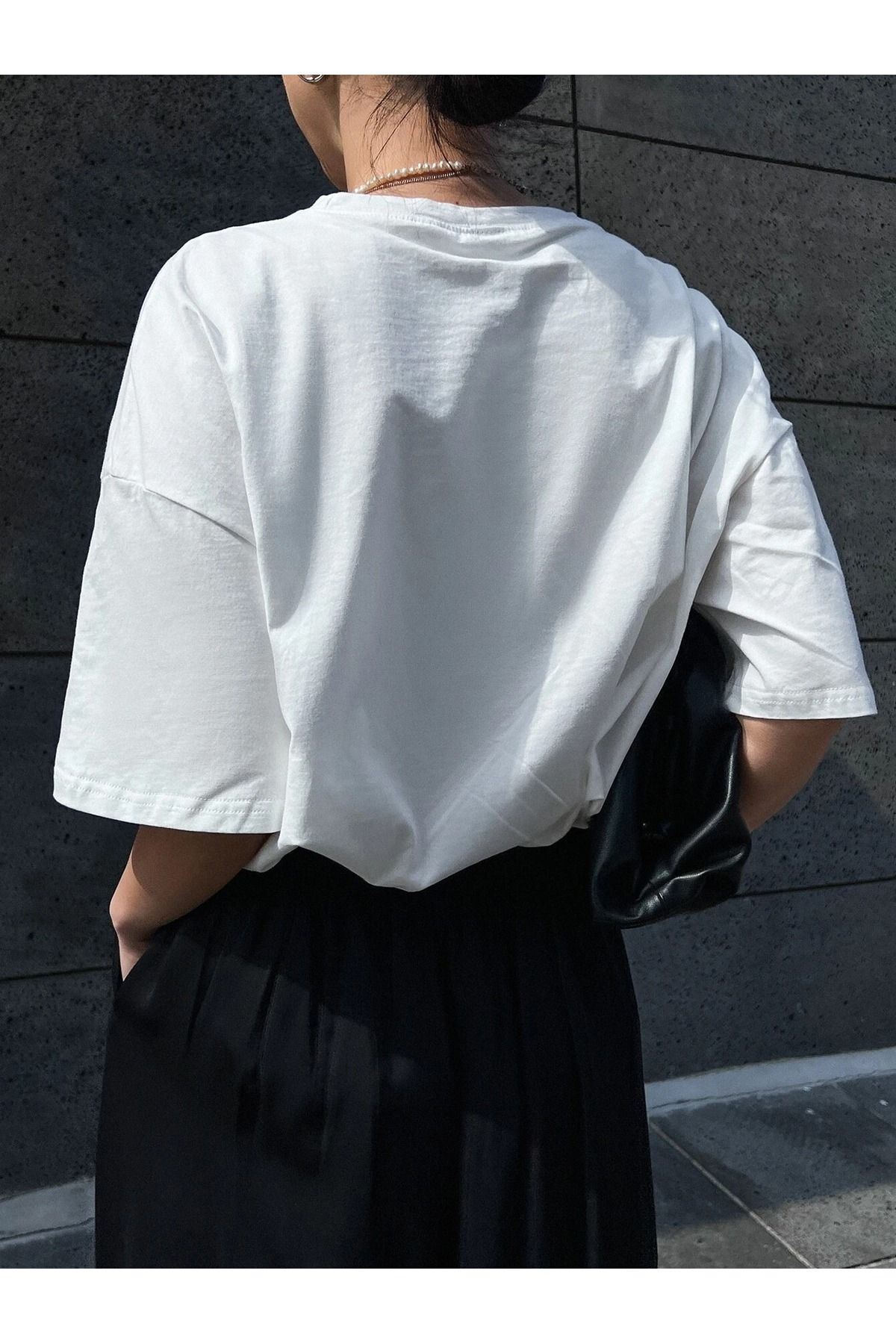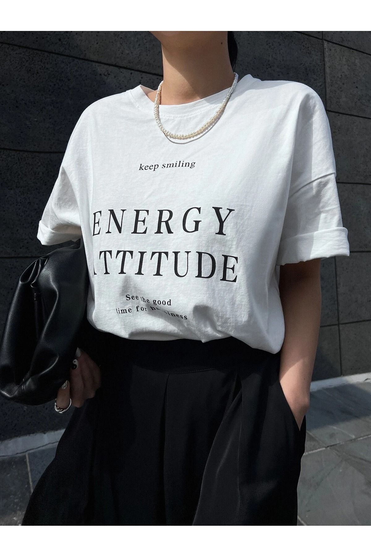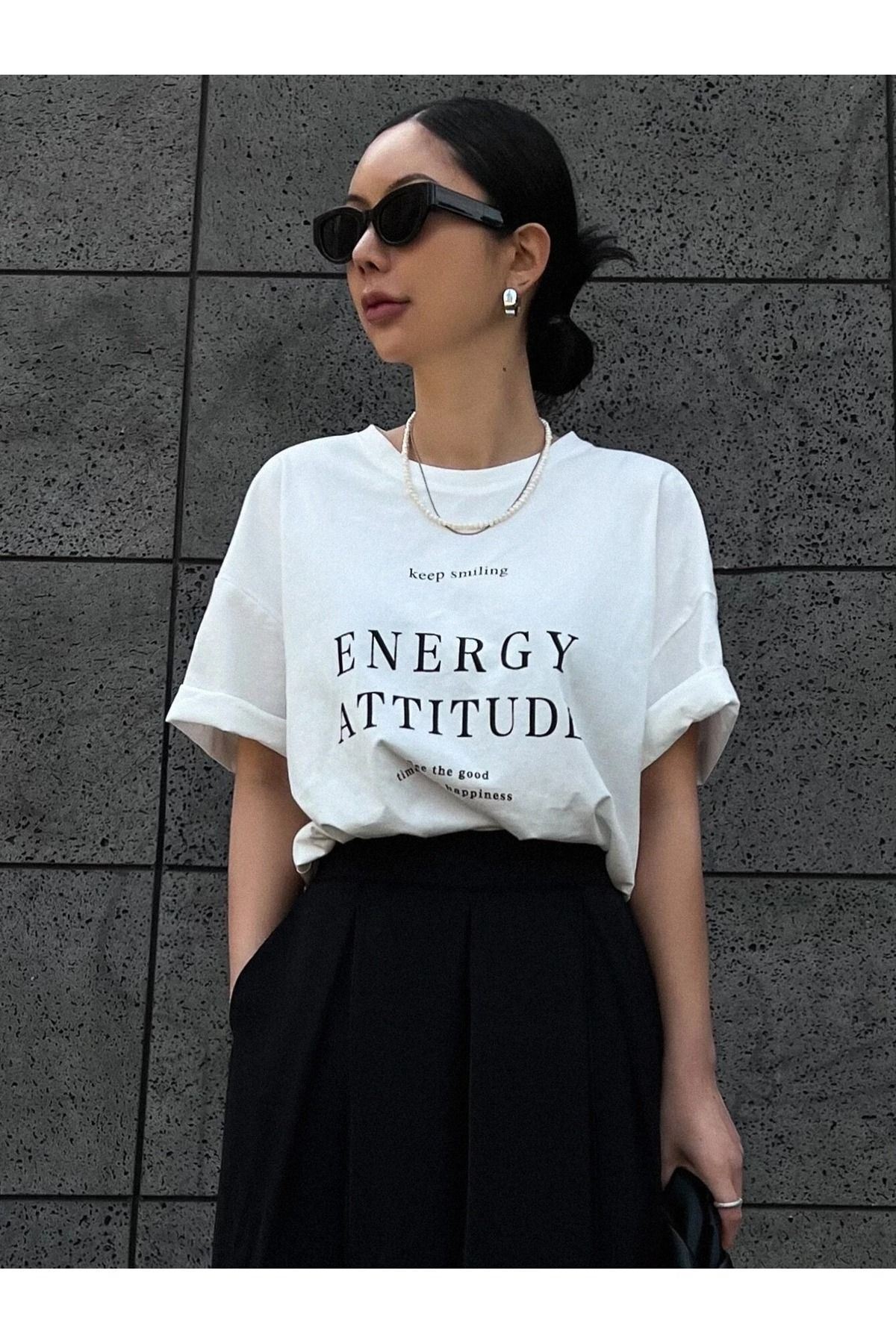 Energy Attitudy Süprem T-Shirt - Beyaz Baskılı Oversize Bisiklet Yaka Kısa Kol Tişört