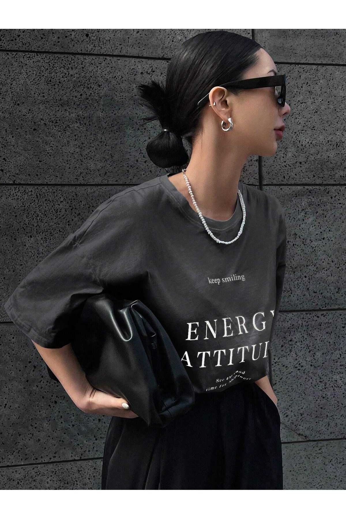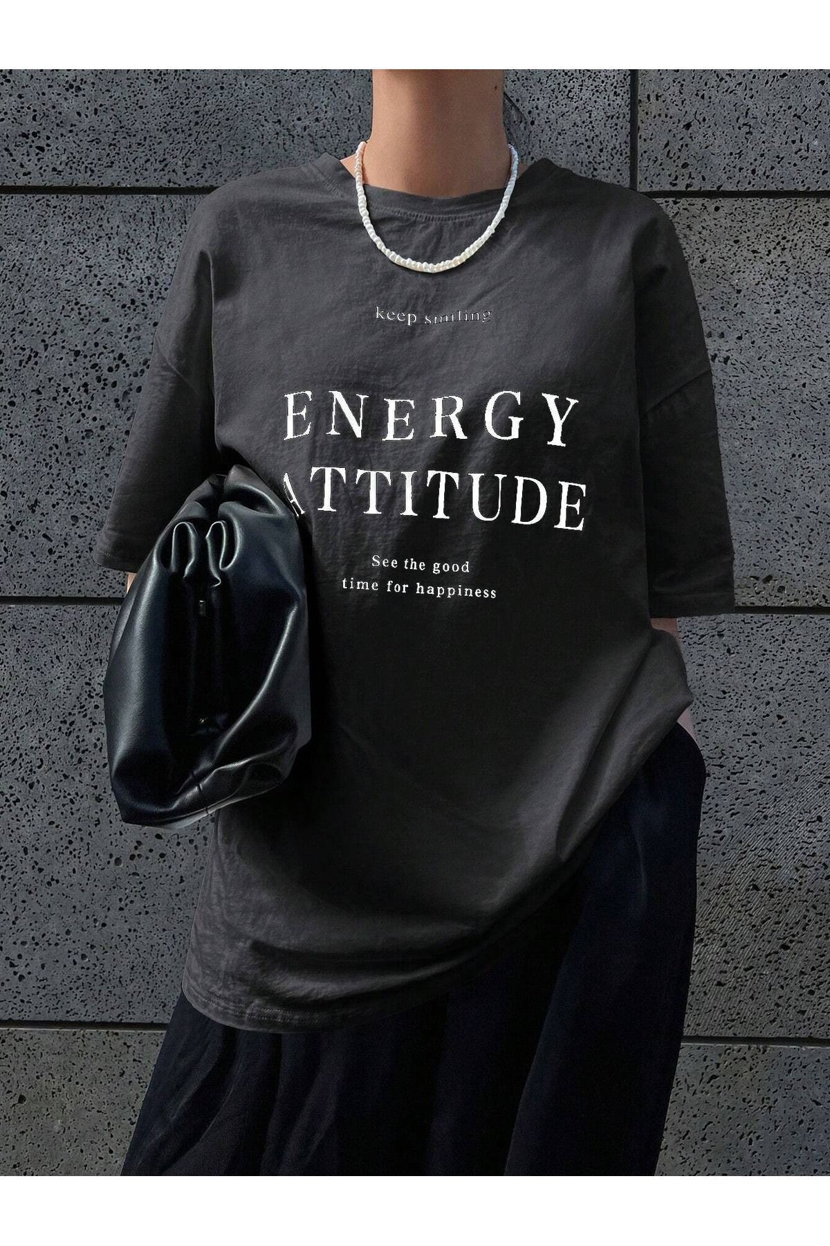 Energy Attitudy Süprem T-Shirt - Füme Baskılı Oversize Bisiklet Yaka Kısa Kol Tişört